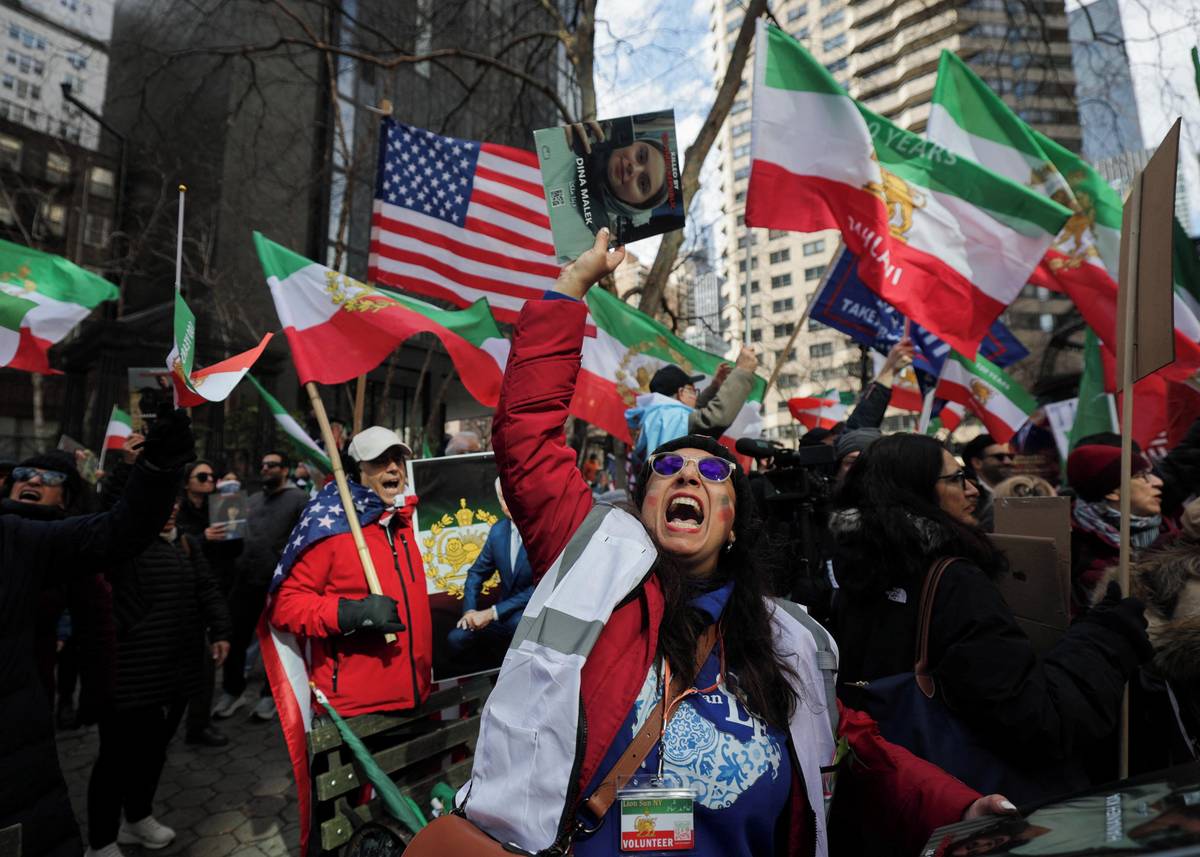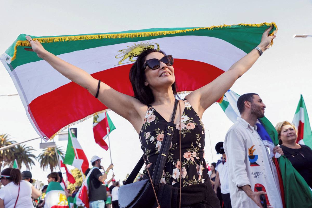 Íránská vlajka v Los Angeles. Takový outfit by si „doma“ Íránky dovolit nemohly.