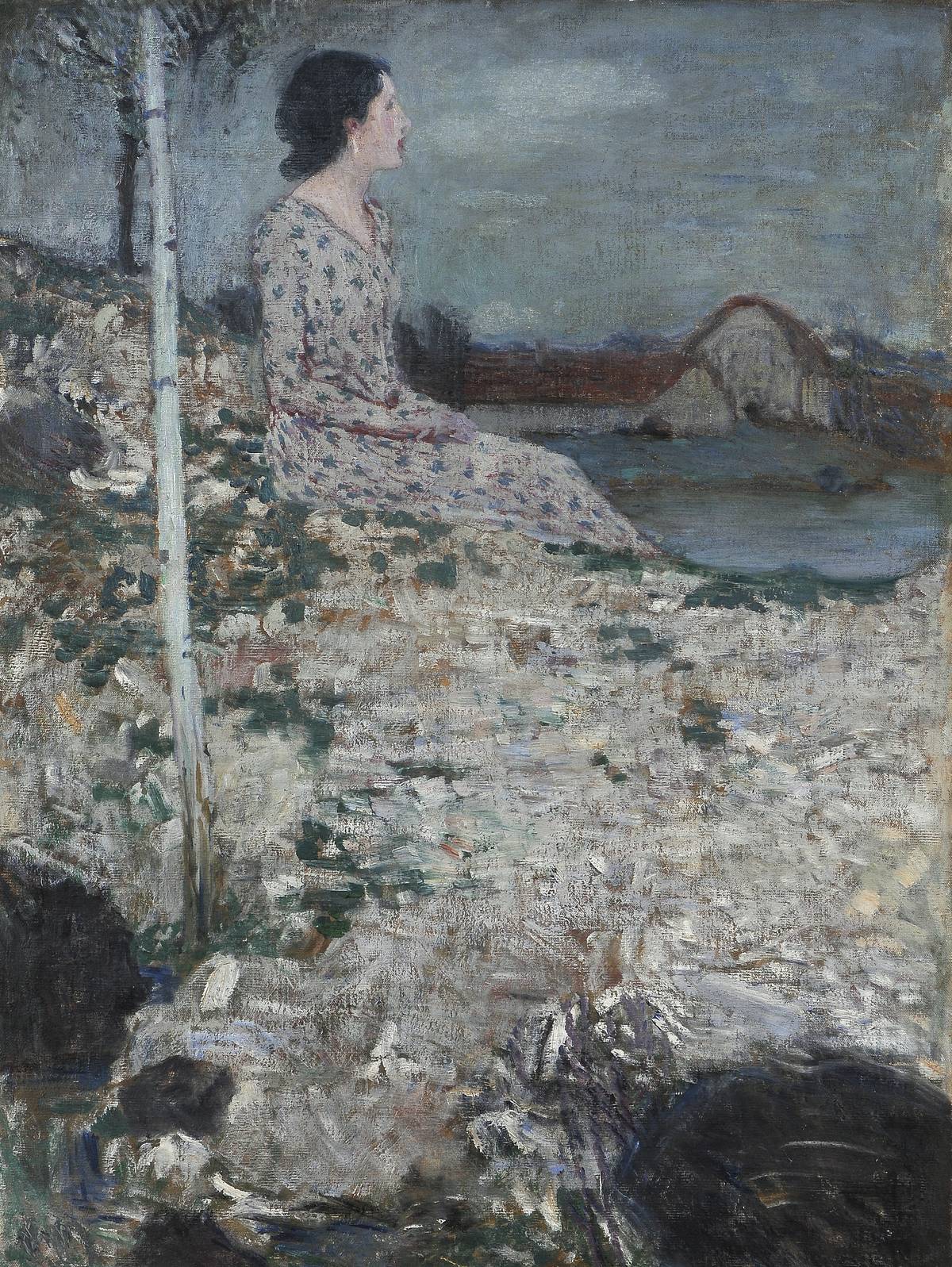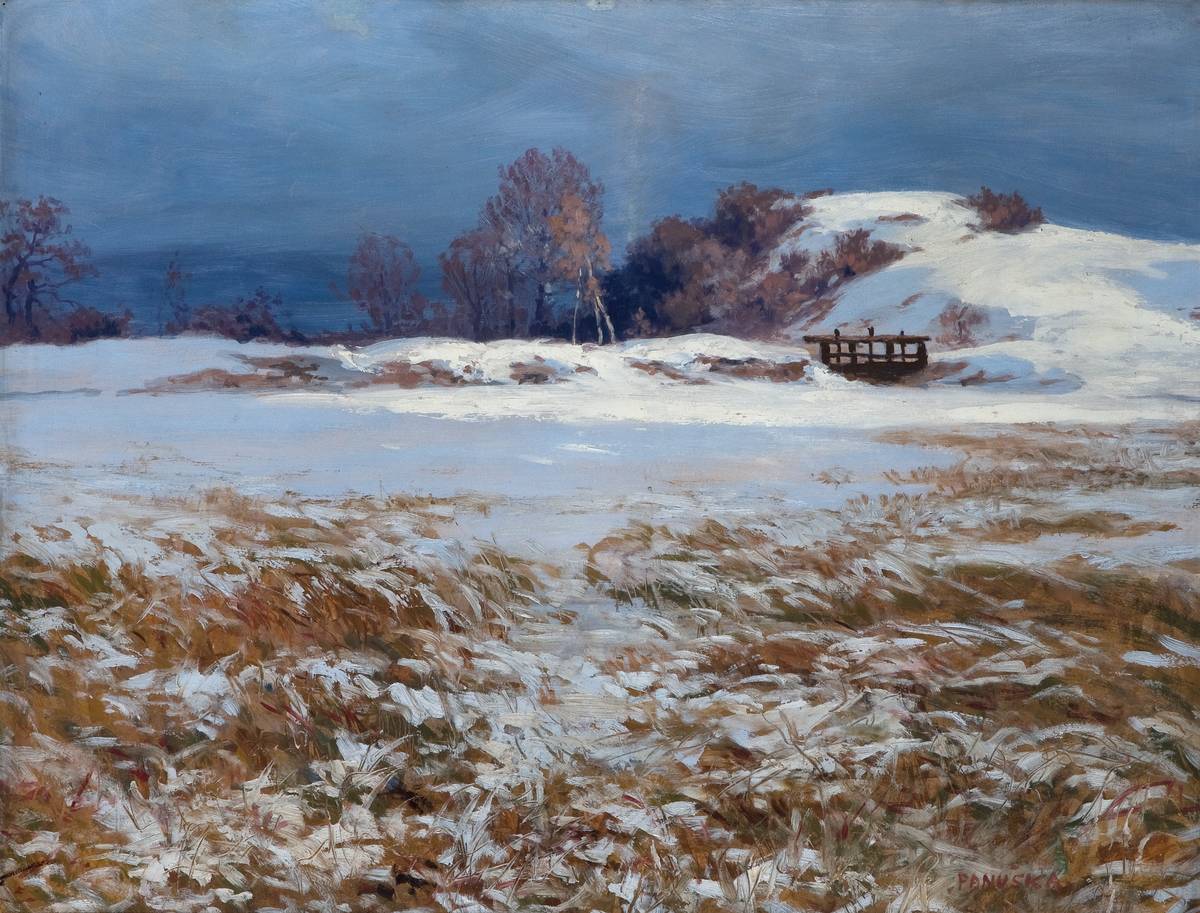 Jaroslav Panuška: Hráz rybníka, před 1919, lepenka, olej, 55 × 71 cm, sbírka GMU.