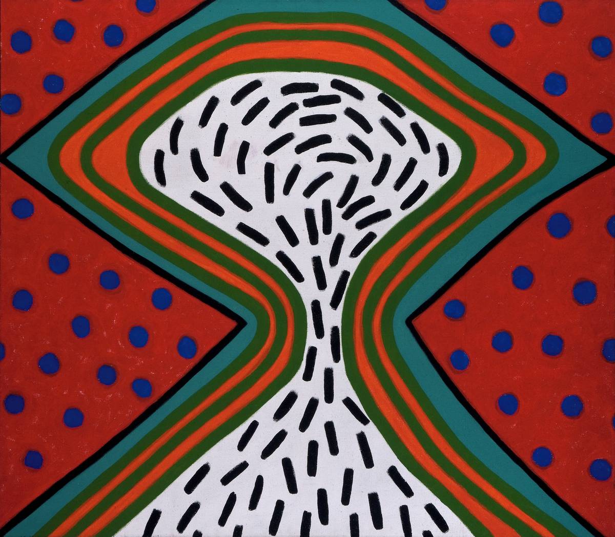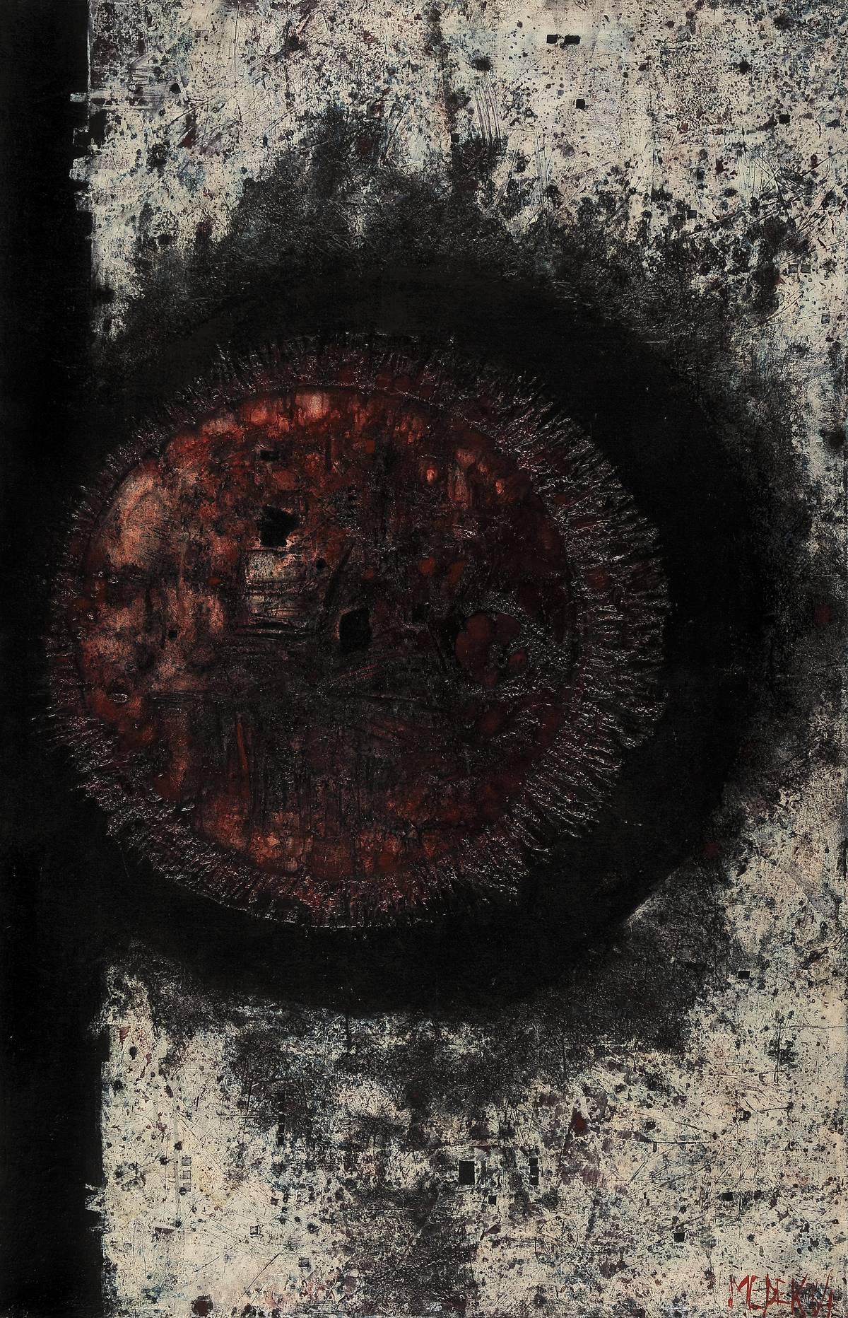 Mikuláš Medek: Manifestace kruhu, 1964, olej, email, plátno, 145,5 × 94 cm, sbírka GMU.