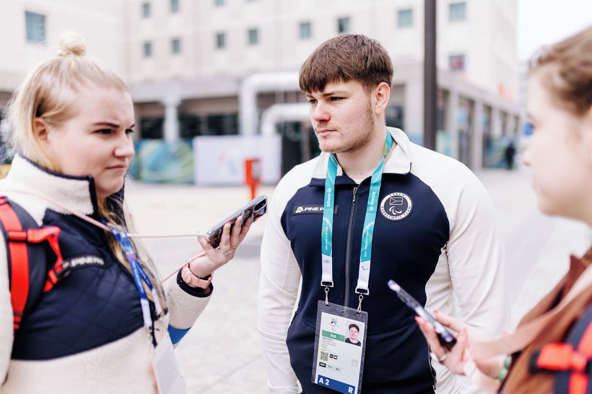 Parahokejista Filip Veselý během rozhovoru s novináři v paralympijské vesnici