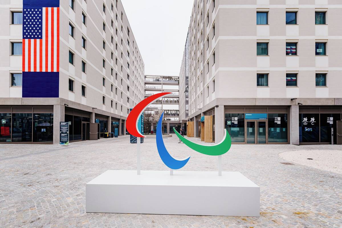 Na náměstí mezi budovami v paralympijské vesnici dominuje logo paralympiády