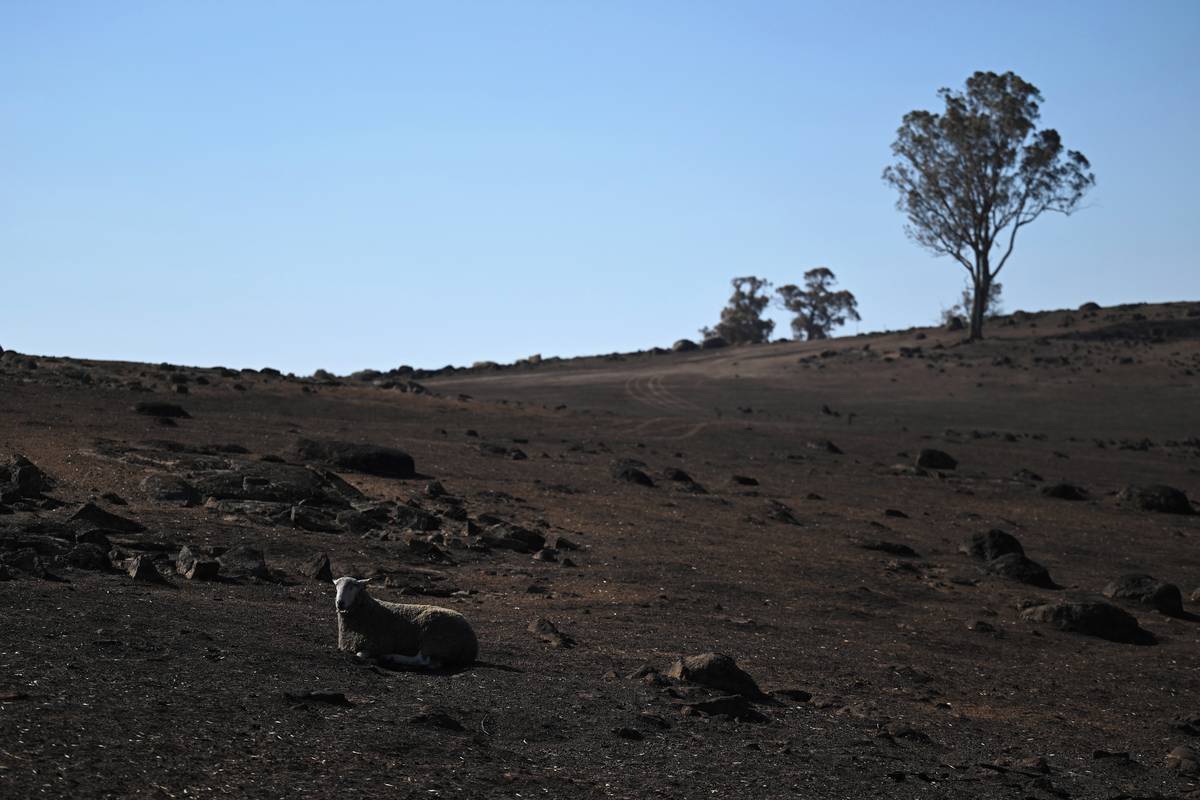 (Zraněná ovce na spálené pastvině v Ruffy, 11. ledna 2026.)