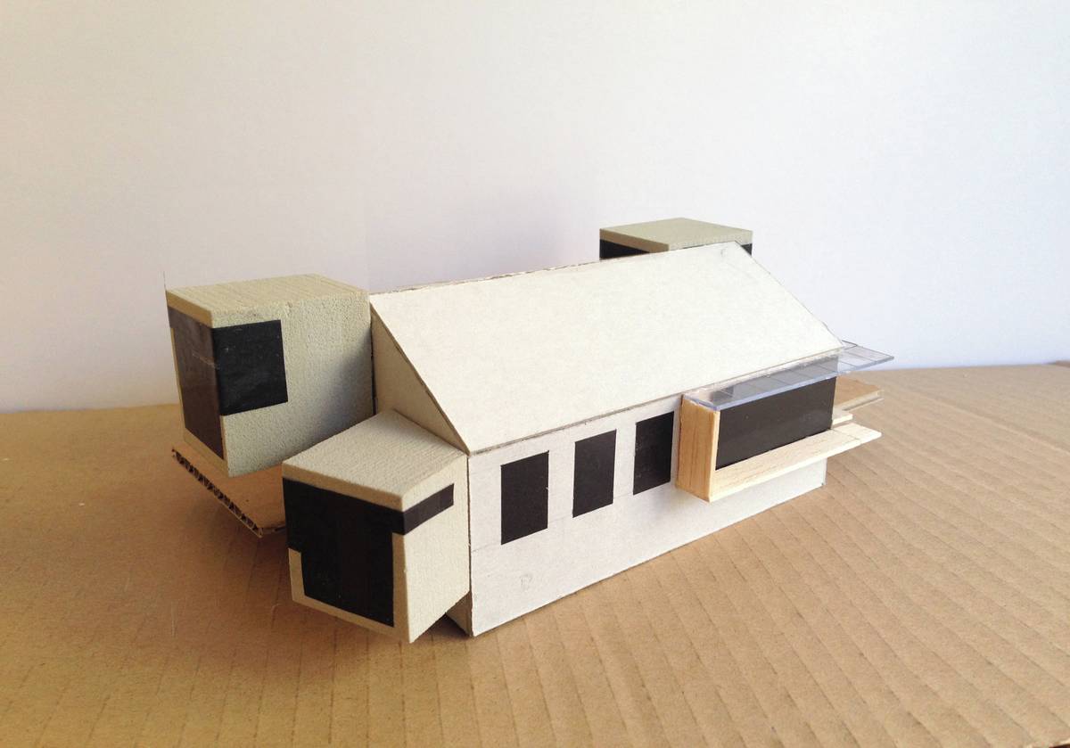 Na tomto nákresu fasády je nejlépe patrný trik s posunutím hřebene nové stavby tak, aby celek i s přístavbou působil symetricky.