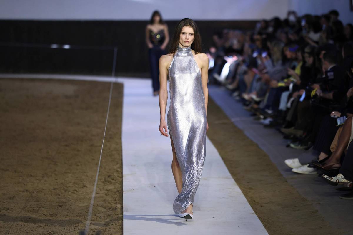 Saténové třpytivé večerní šaty z kolekce Stella McCartneyové podzim/zima 2026-2027
