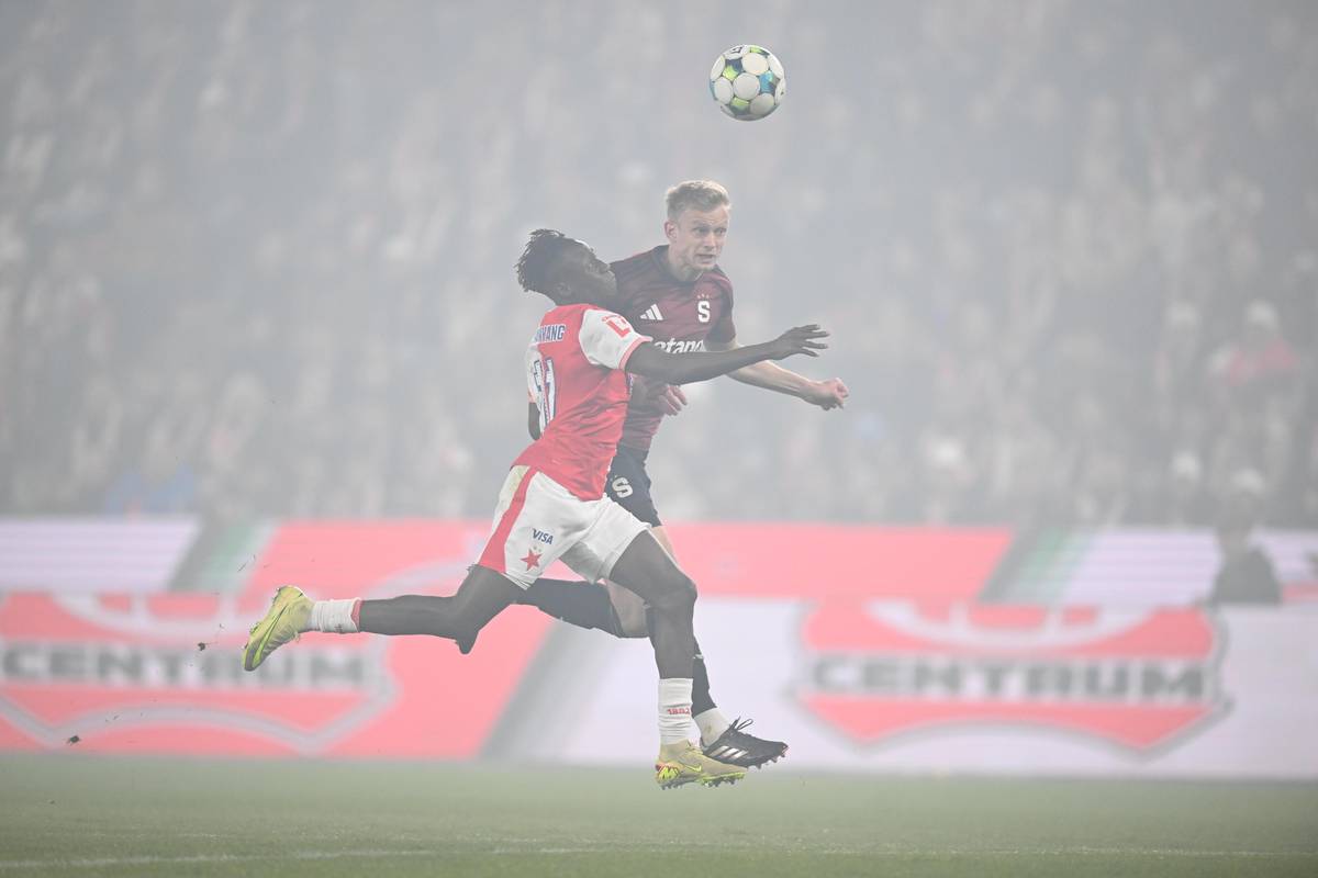 Sparťan Jaroslav Zelený v souboji se slávistou Youssouphem Sanyangem.