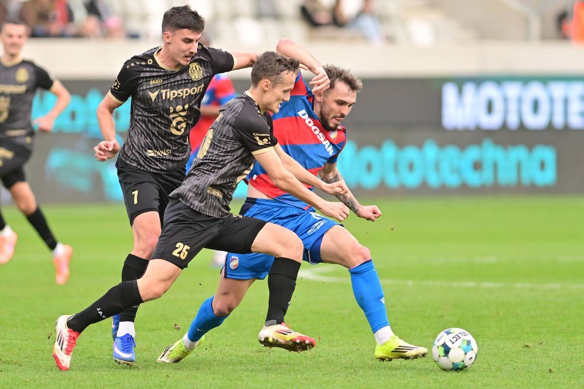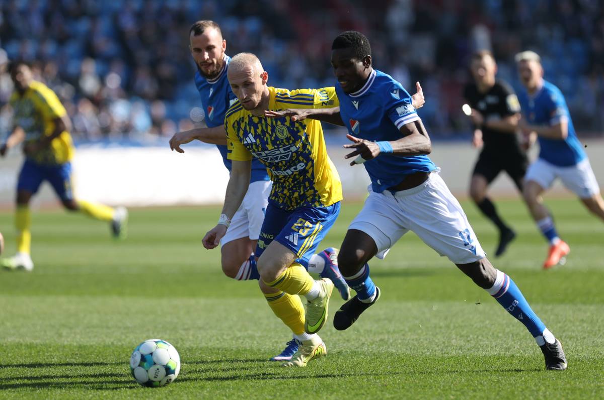 Obránce Baníku Ondřej Kričfaluši (vlevo) překonává brankáře Zlína Stanislava Dostála.