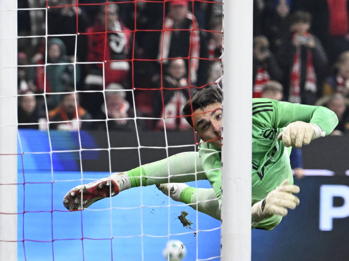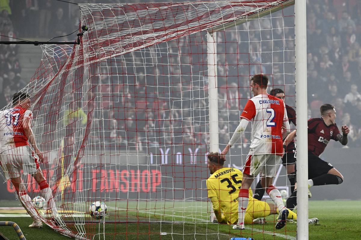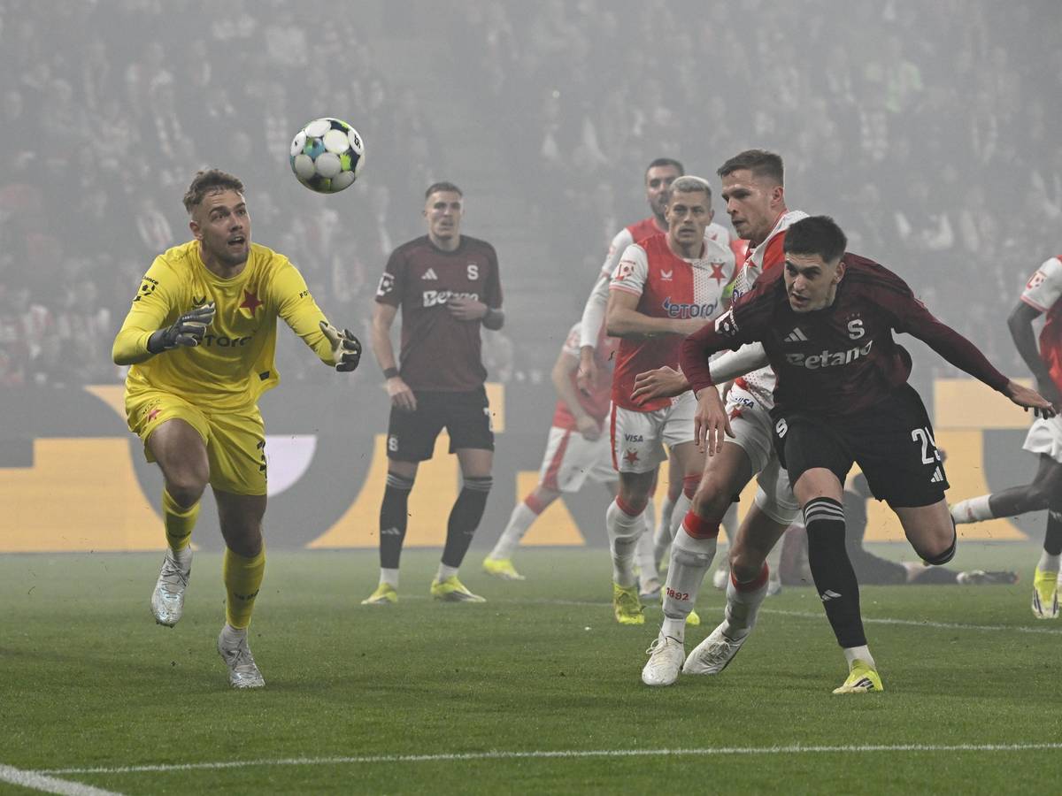 Chvíle před prvním gólem Sparty. Brankář Slavie Jakub Markovič se marně natahuje po míči, který končí na břevnu a pak se odrazil k Vydrovi.