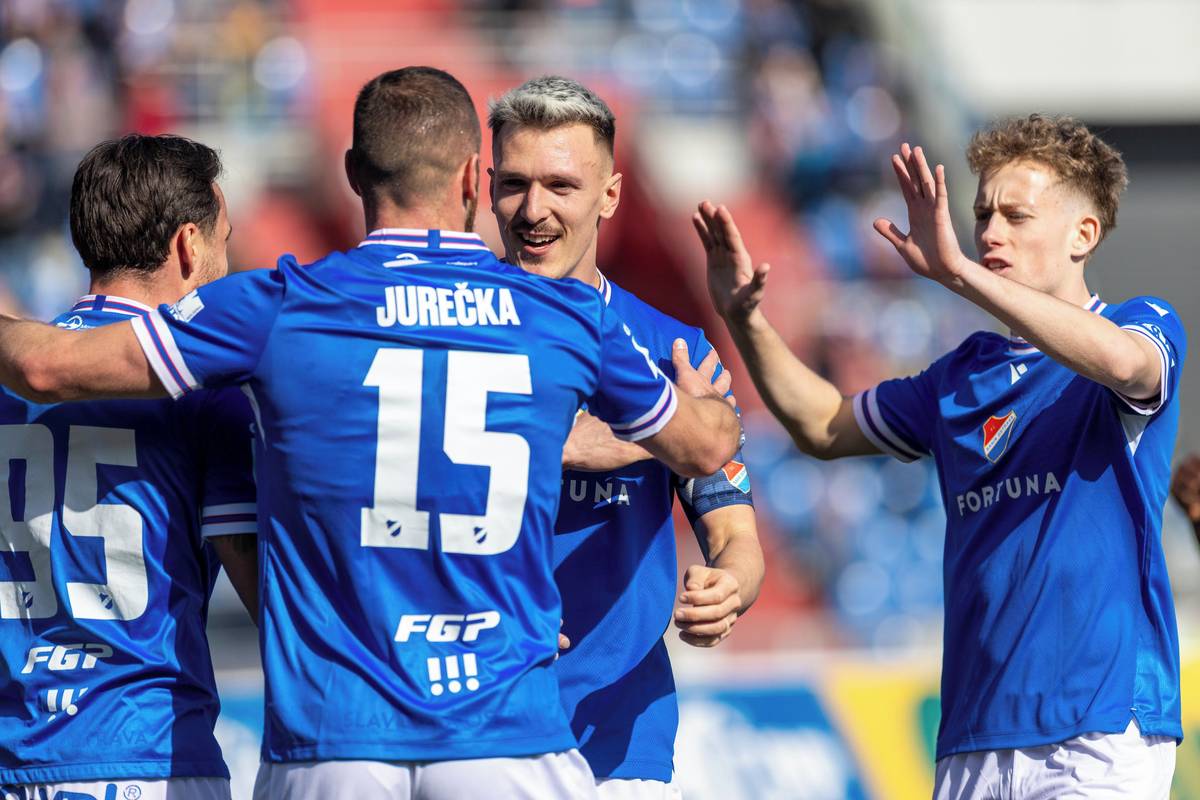 Spokojení hráči Plzně oslavují druhý gól do sítě Hradce.
