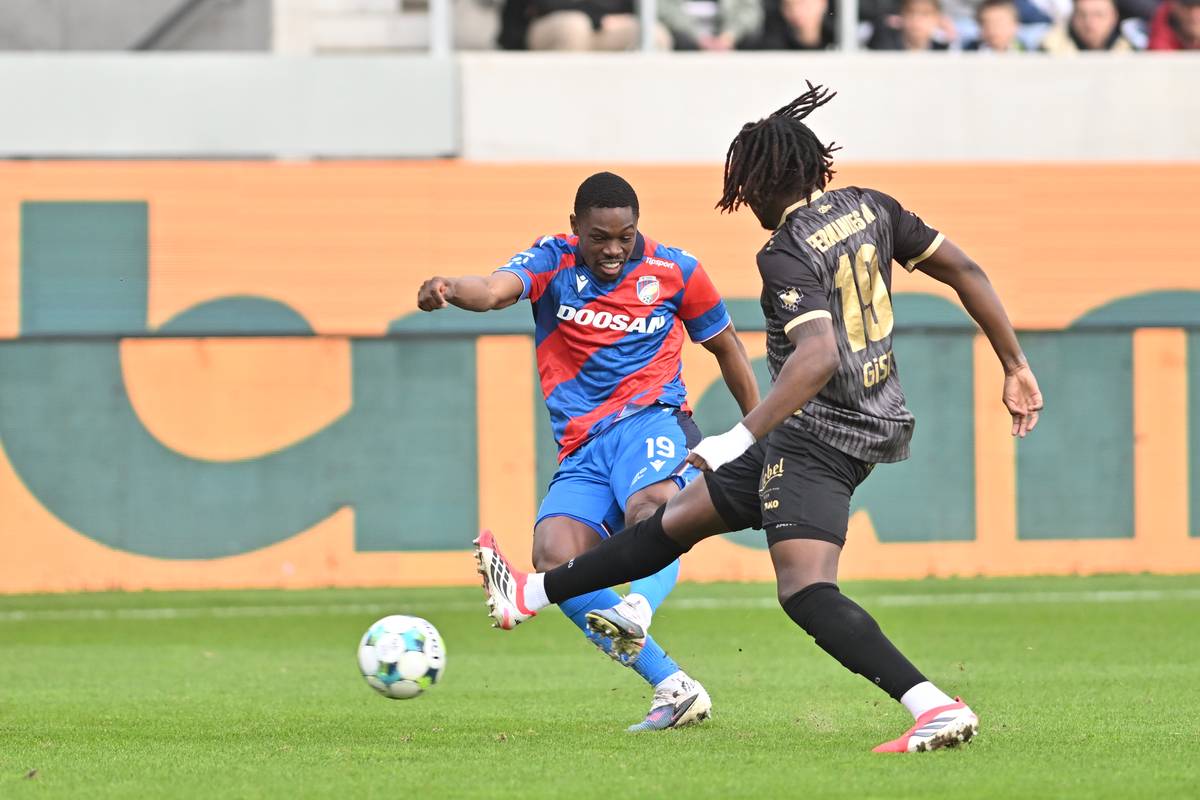 Záložník Plzně Cheick Souaré odkopává míč před dotírajícím hradeckým soupeřem Fernandesem Netem.