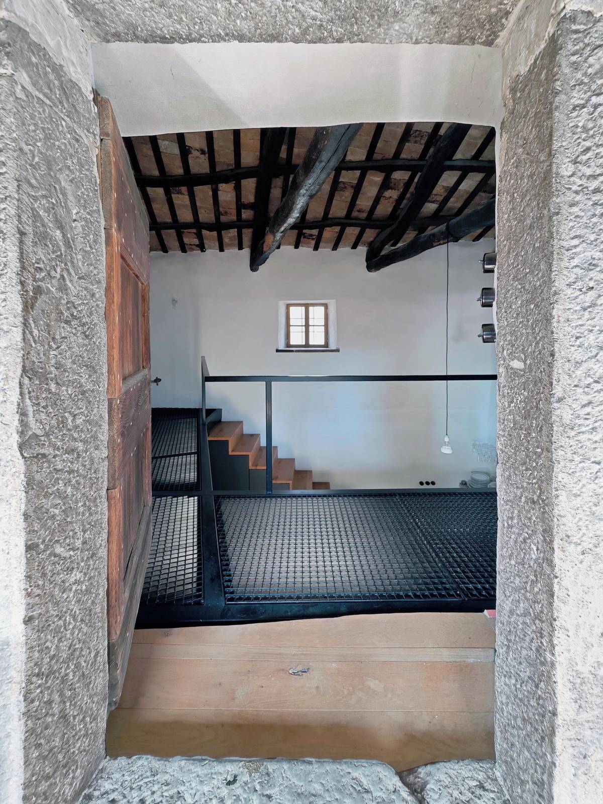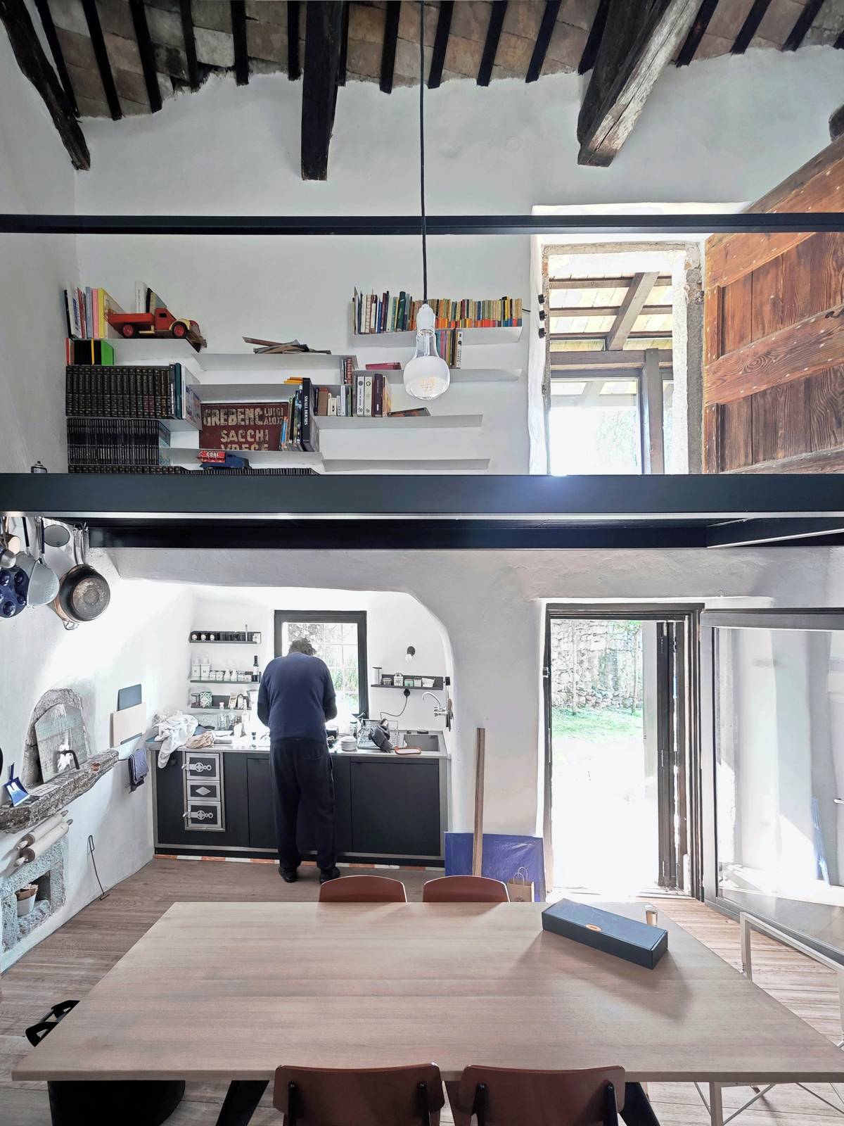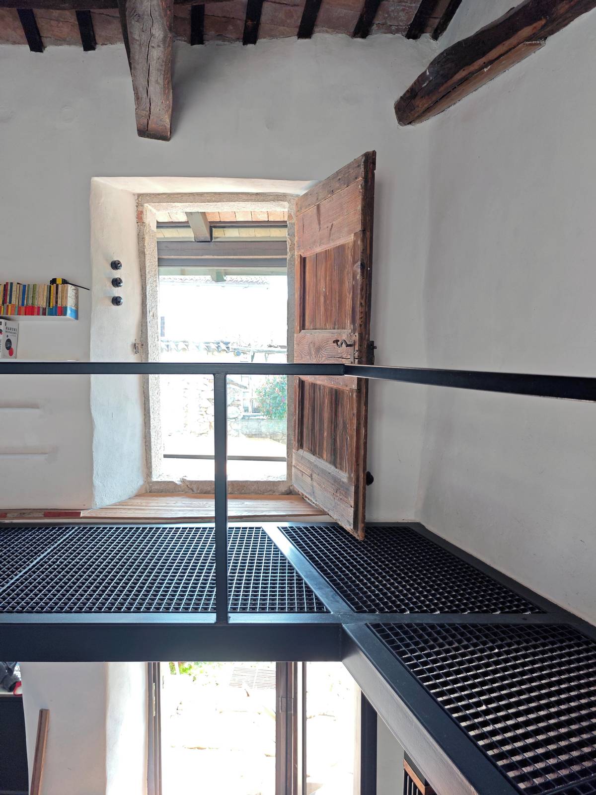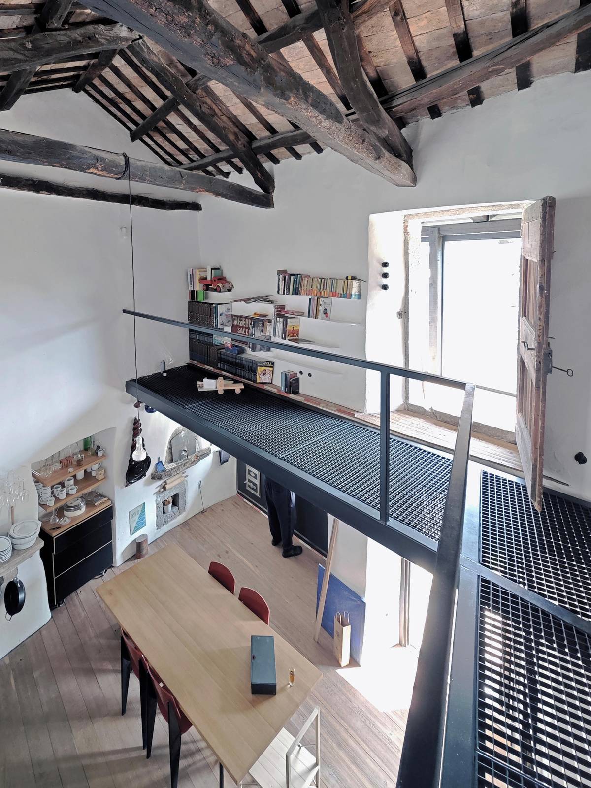 Nad hlavní obytnou místností je moderní kovová galerie.