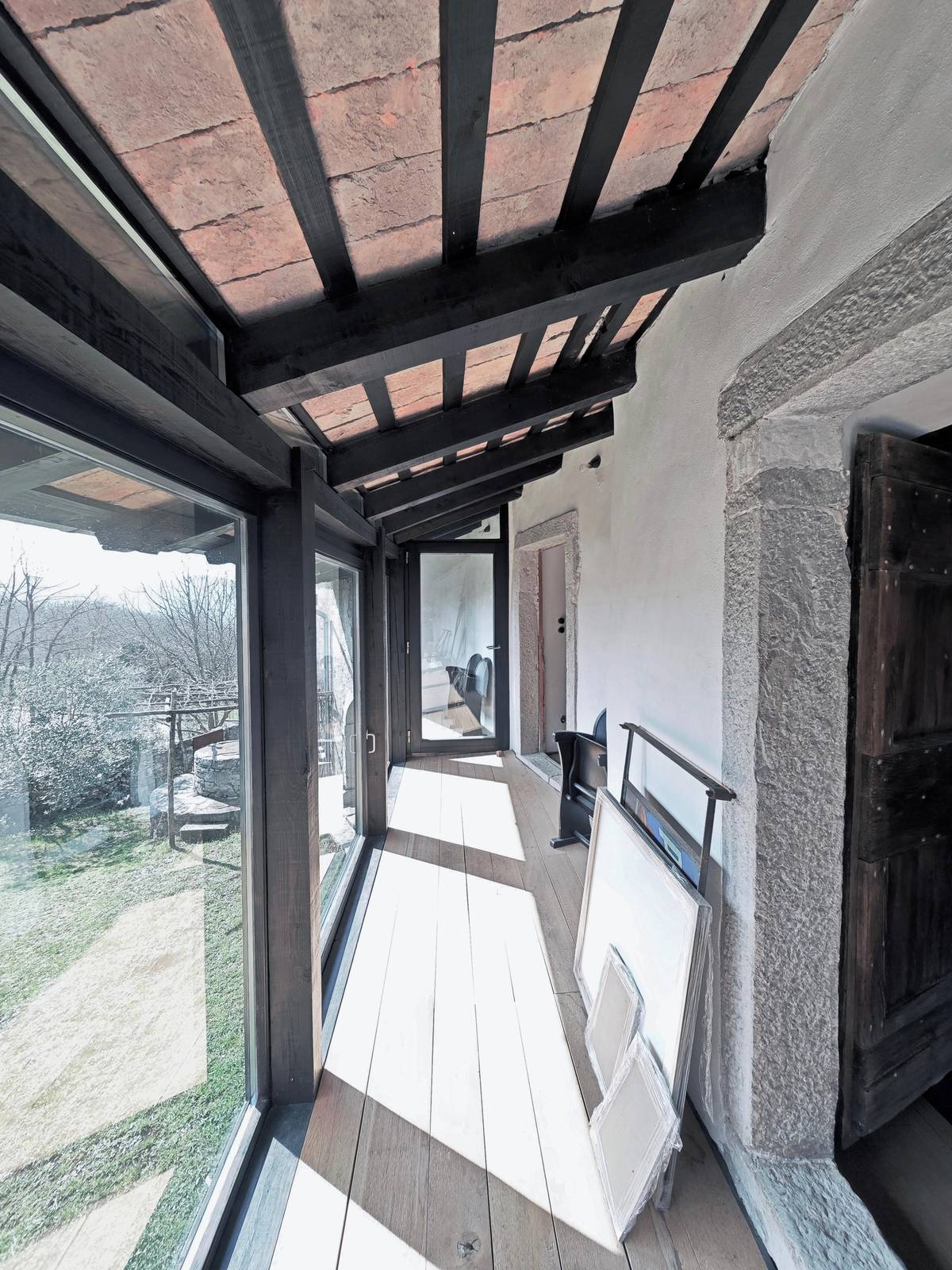 Pavlač s prosklenými stěnami je venkovní chodbou spojující místnosti v horním podlaží.