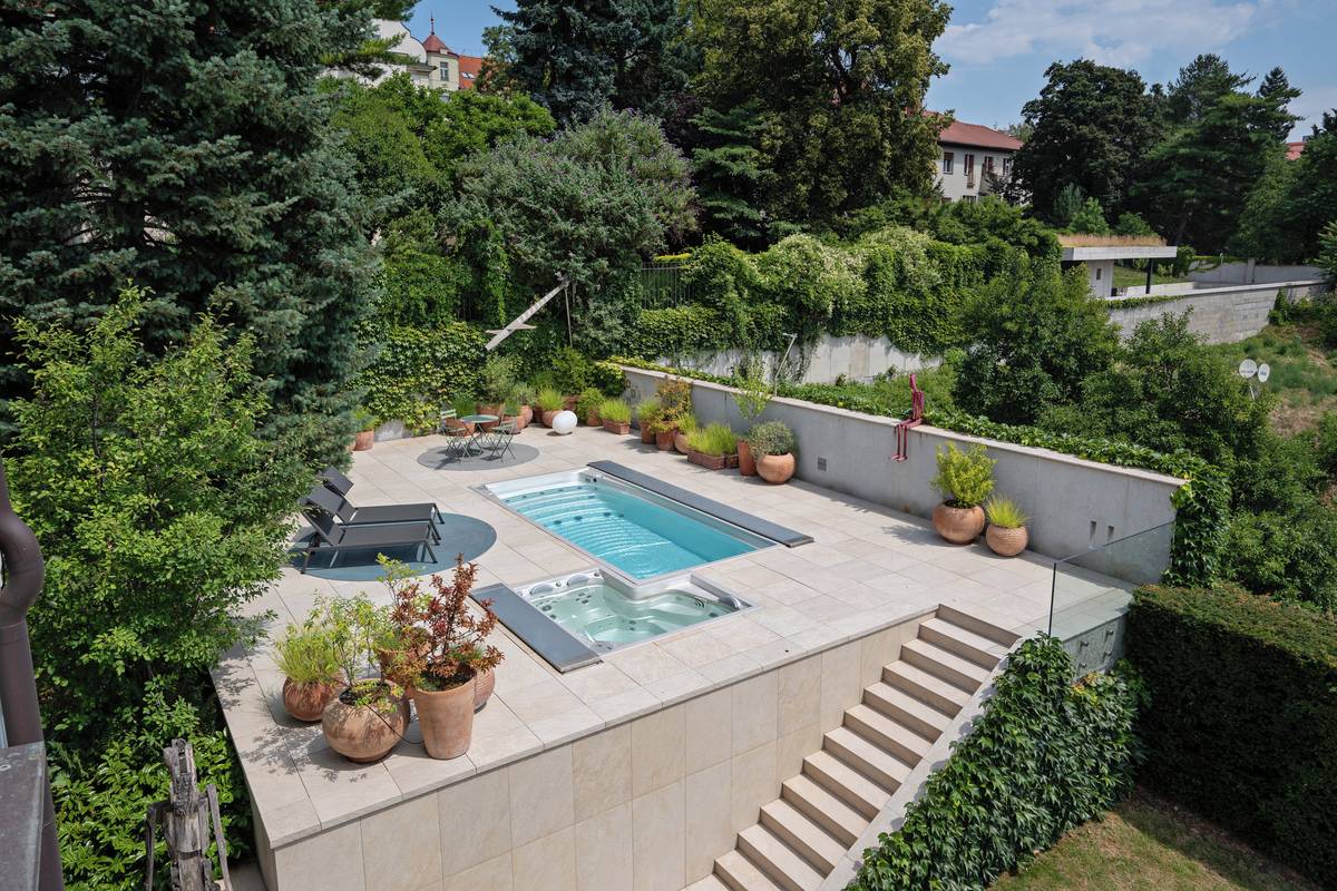 Součástí zázemí je také venkovní bazén, vířivka a vyhřívaná pergola.