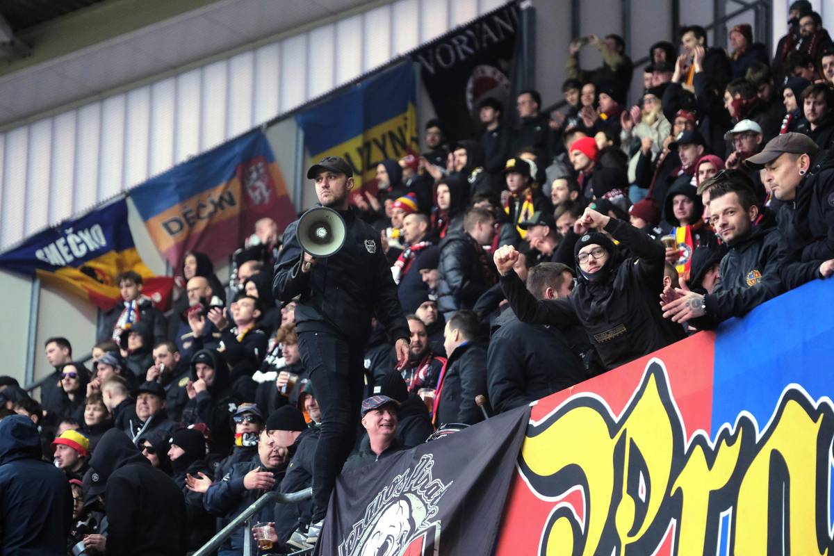 Isak Jensen centruje přes Matěje Ryneše.