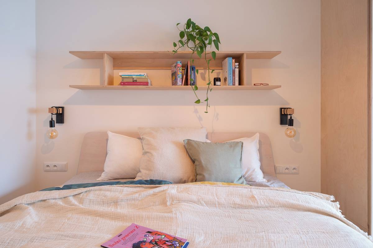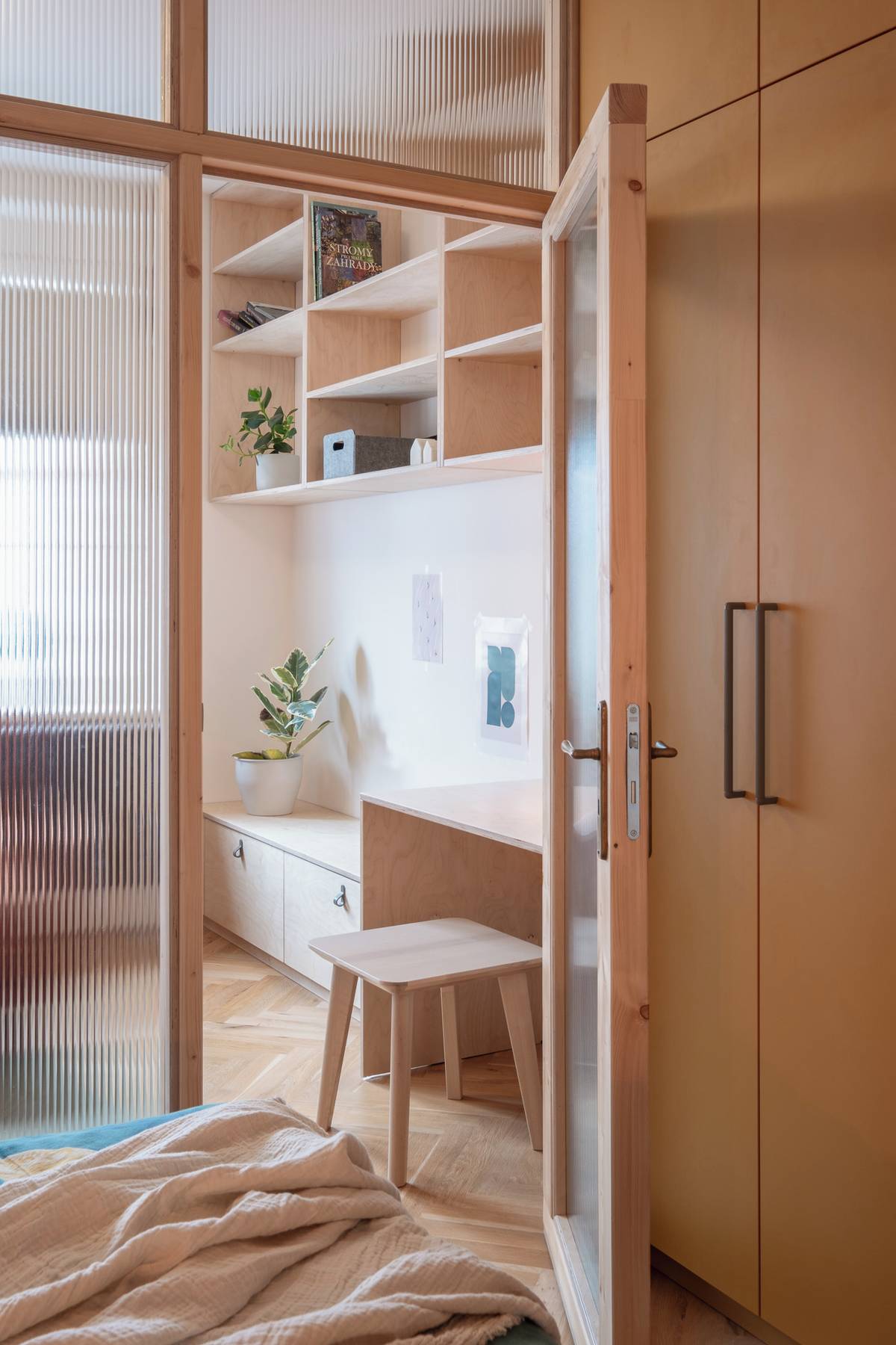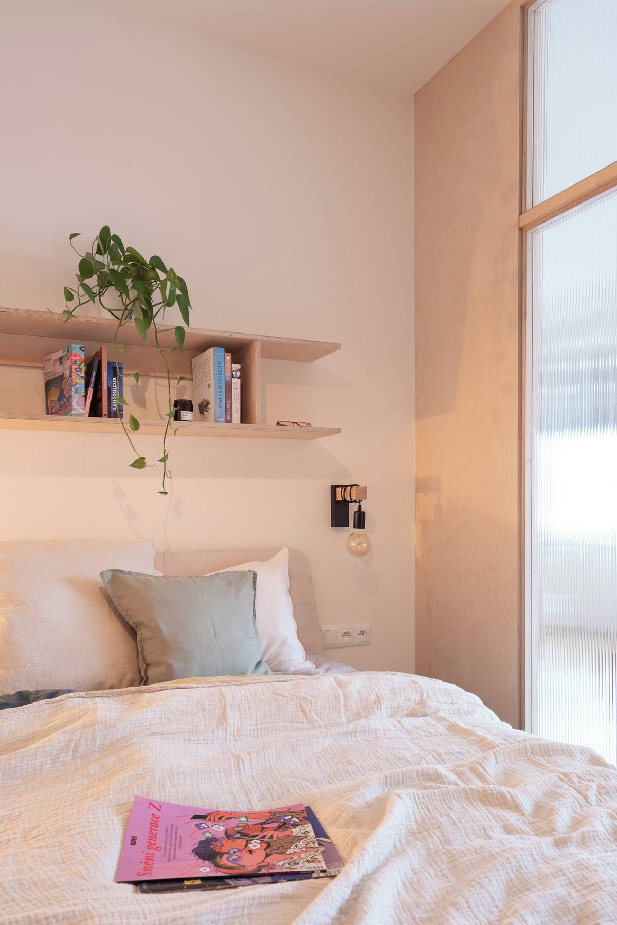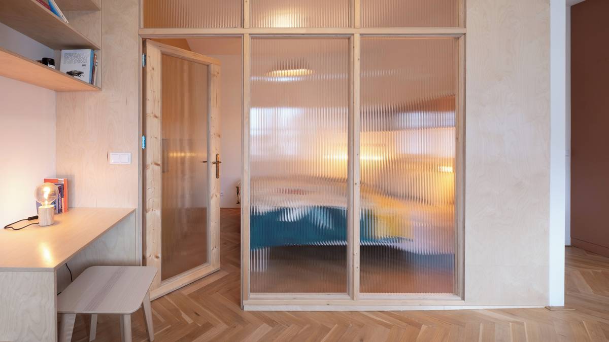 Prosklená stěna odděluje spací část od zbytku prostoru, aniž by ztratila denní světlo.