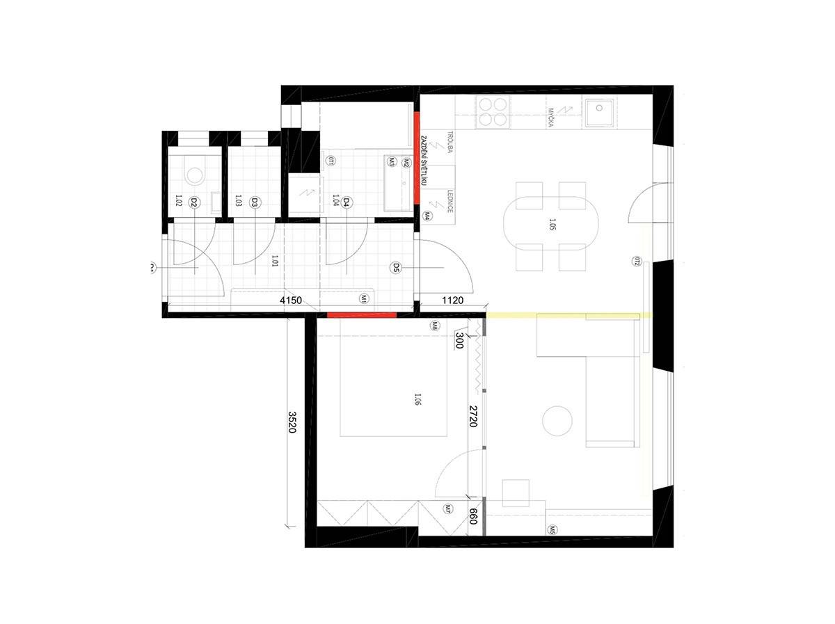 Hlavní obytná plocha je propojená, přesto v ní lze jasně rozlišit jednotlivé funkční zóny.