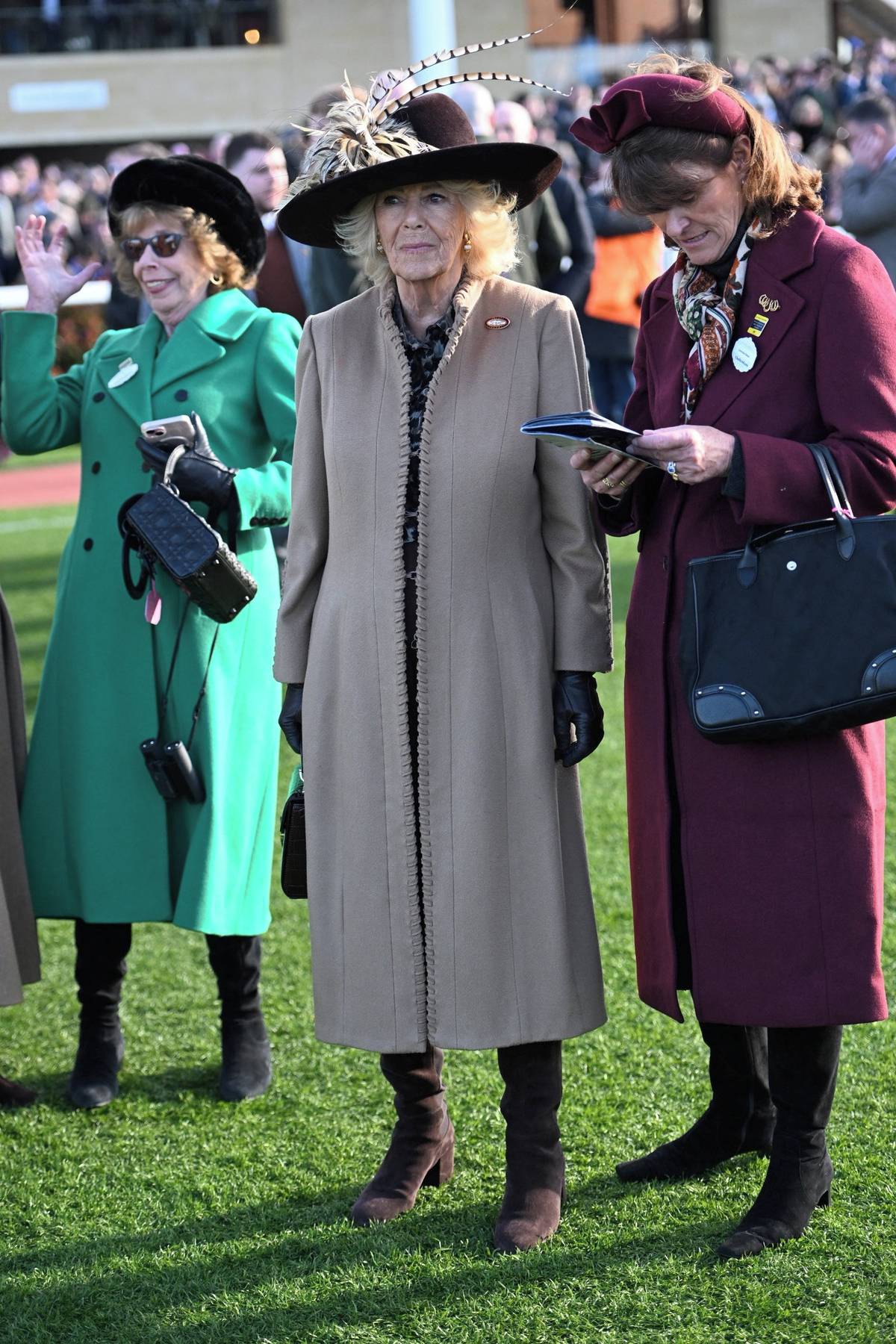 Královna Camilla na sobě měla stylový klobouk předního modisty Philipa Treacyho a kabát od britské módní návrhářky Anny Valentine doplněný stylovými koženými rukavičkami a semišovými kozačkami.