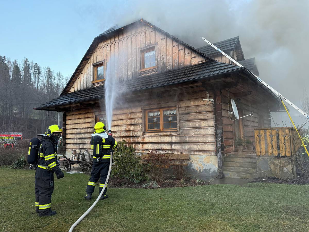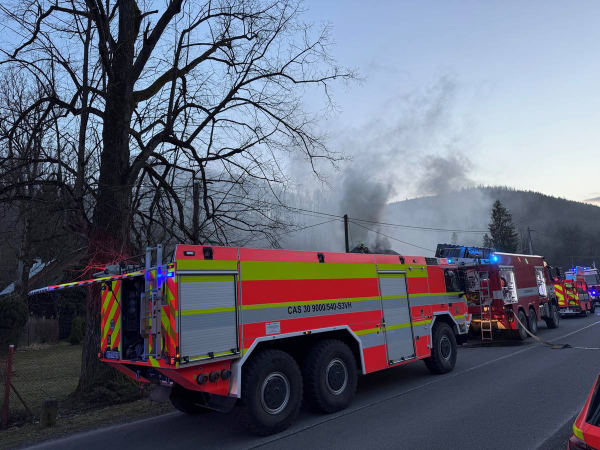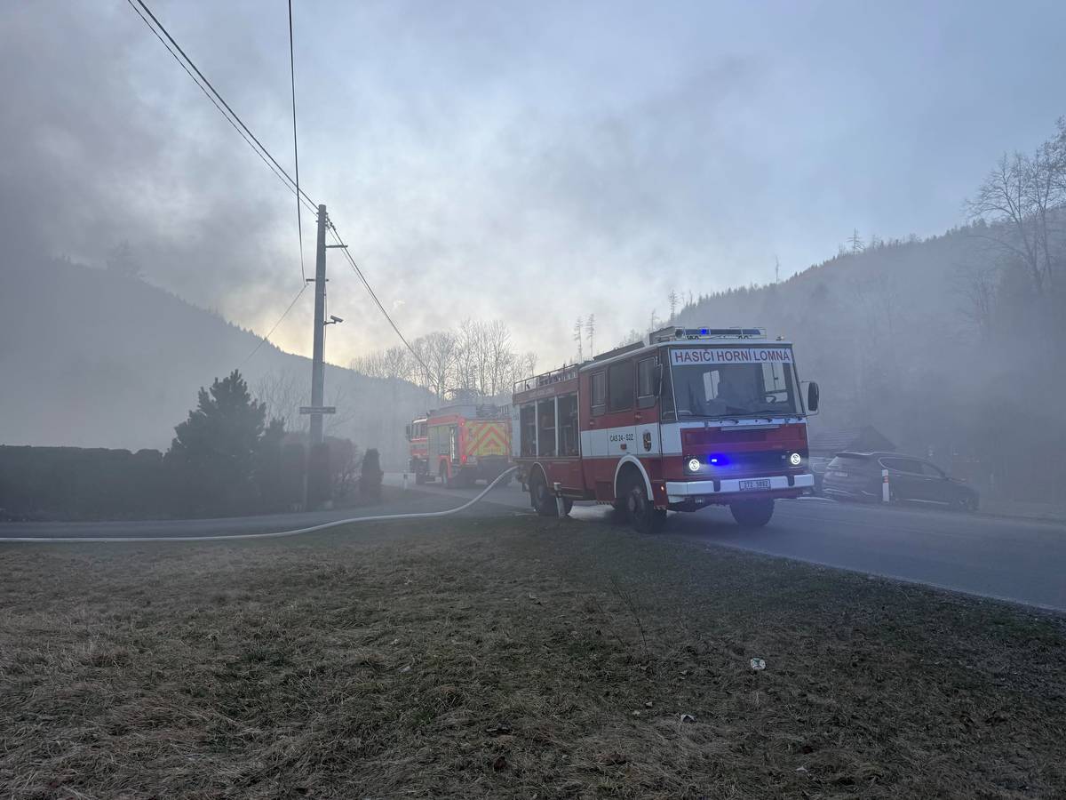 Hasiči likvidují požár rodinného domu v Dolní Lomné.