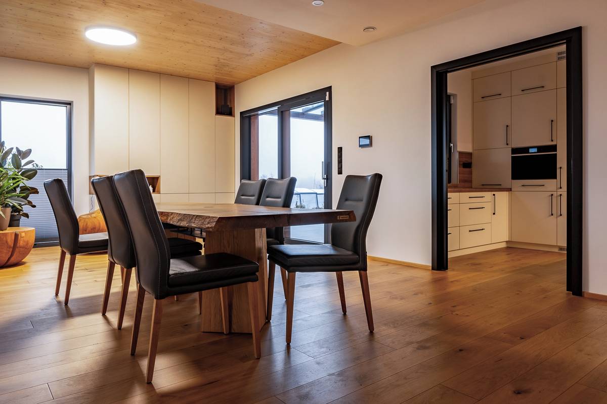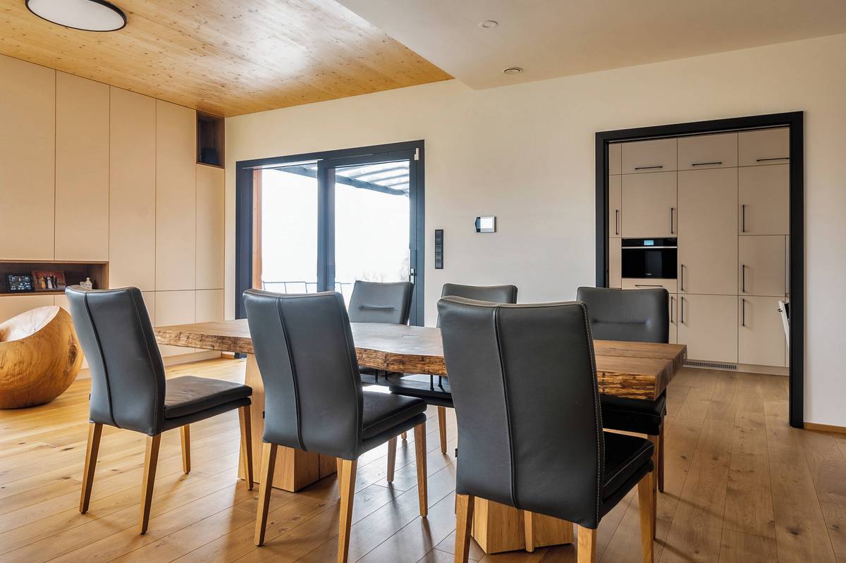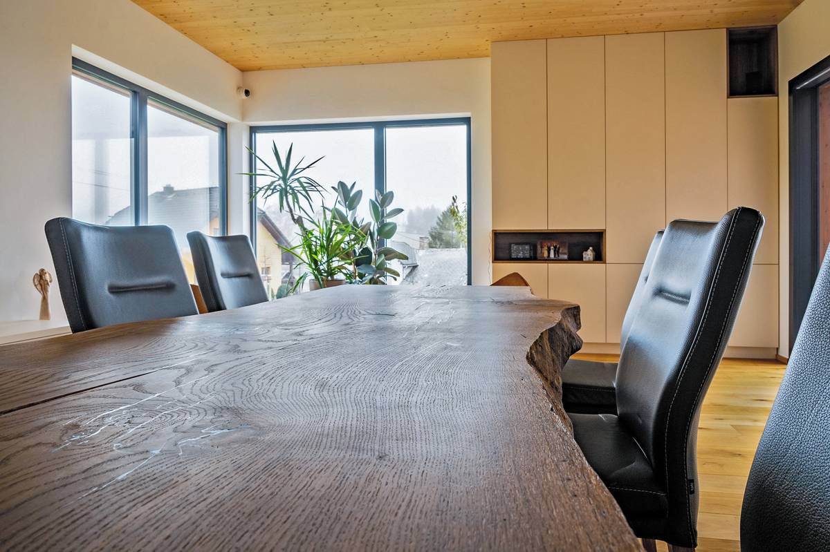 Jídelní stůl má impozantní desku.