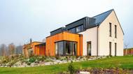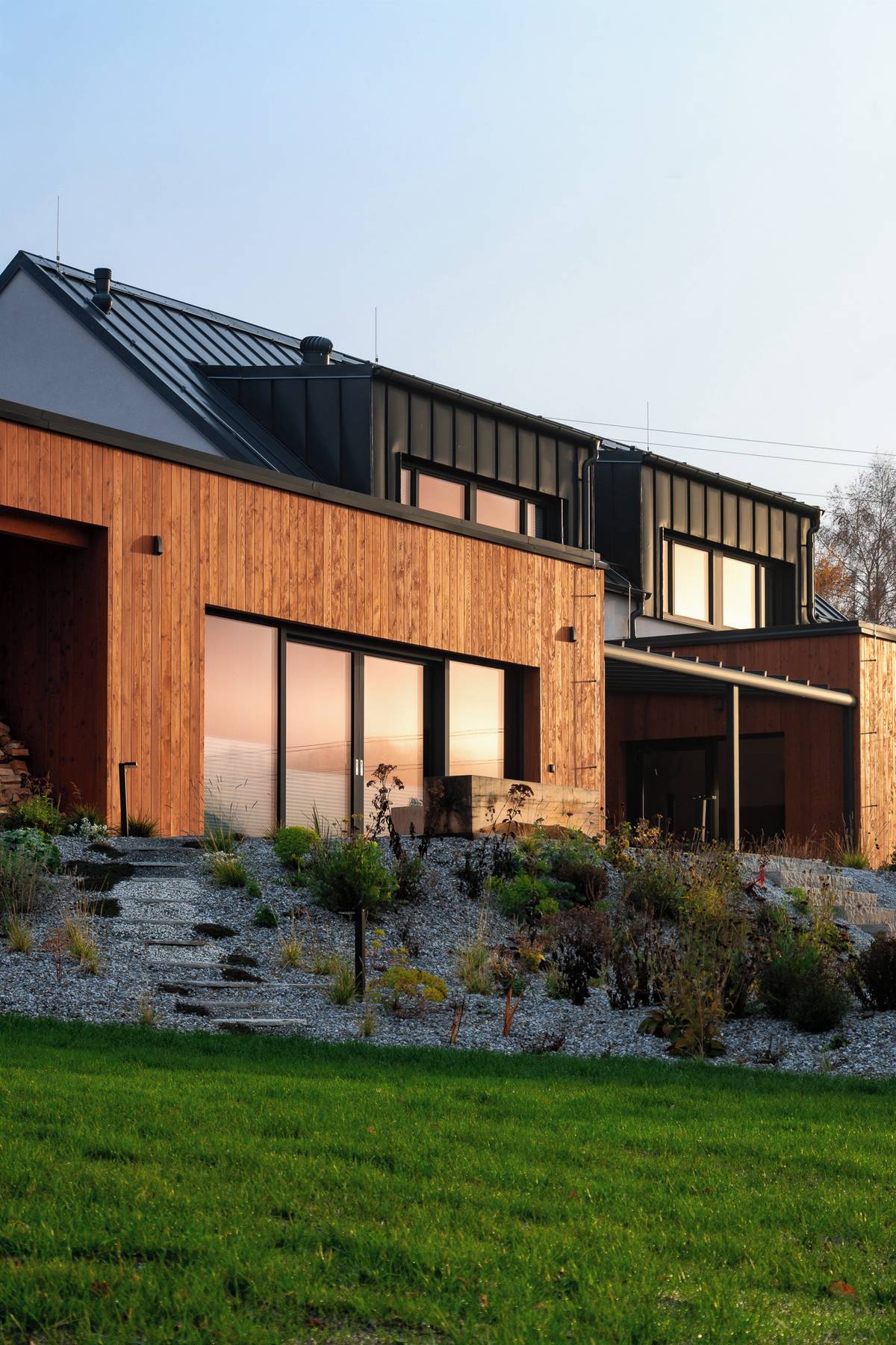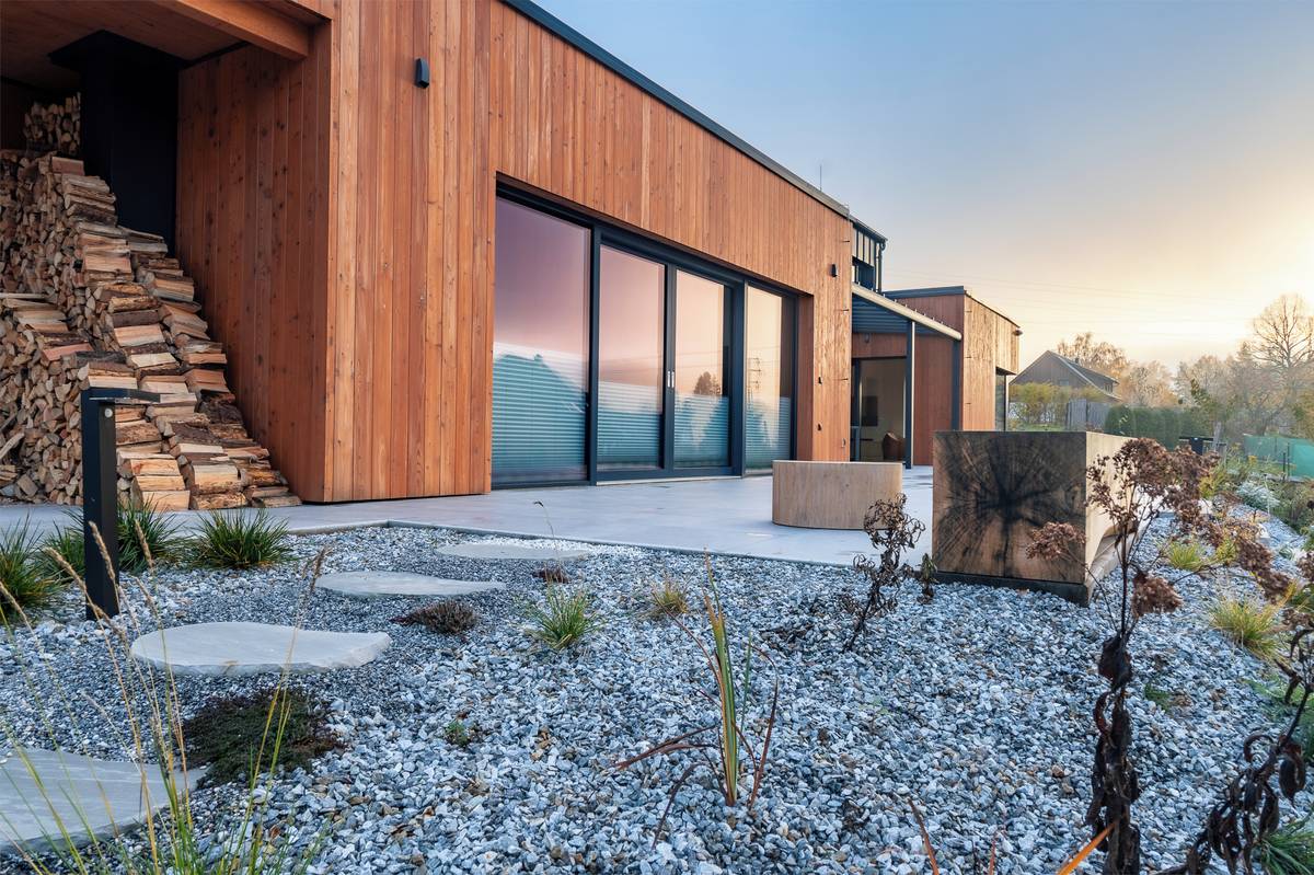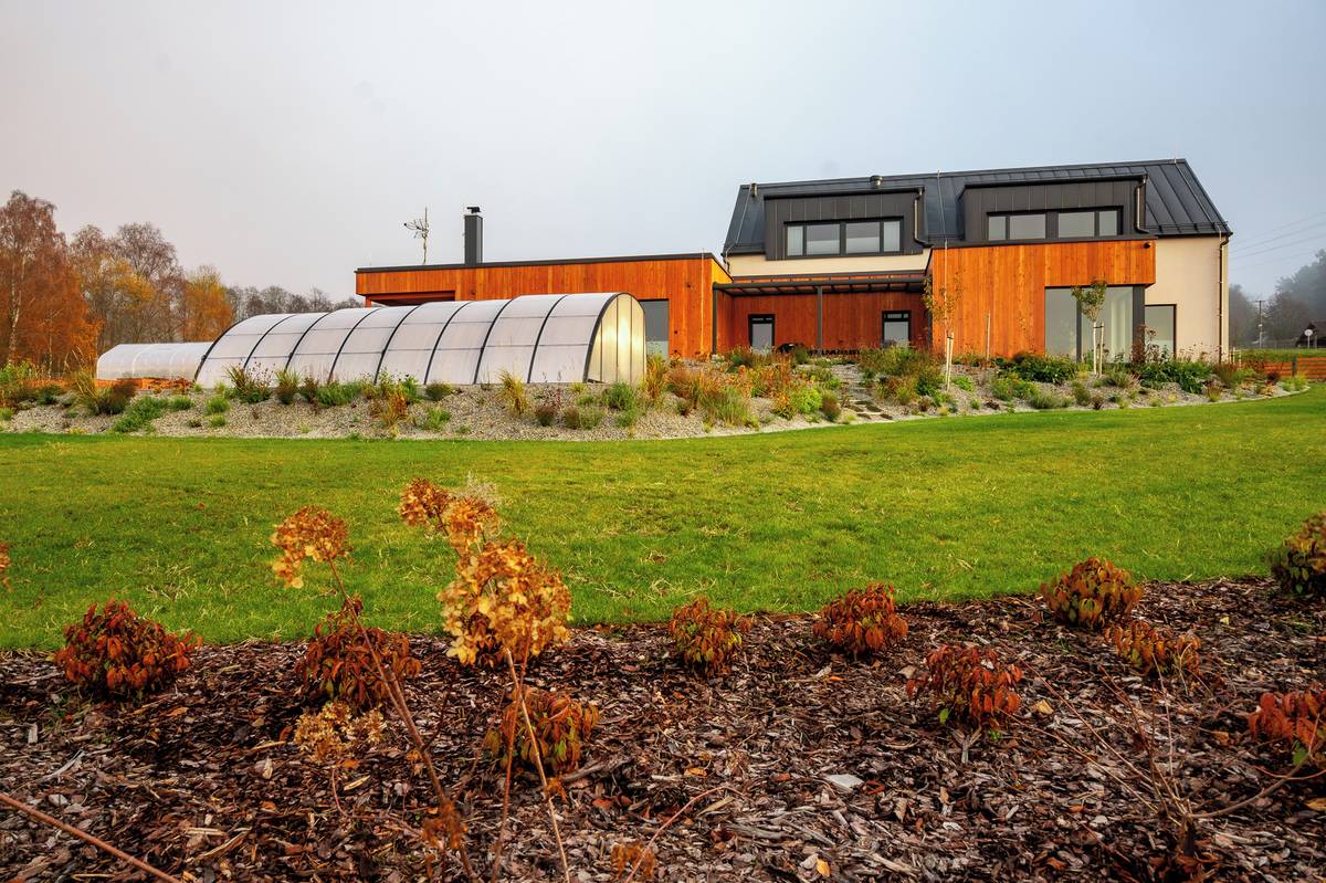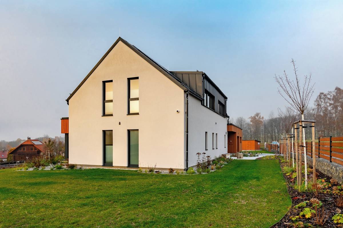 Pohled na dřevostavbu ze zahrady