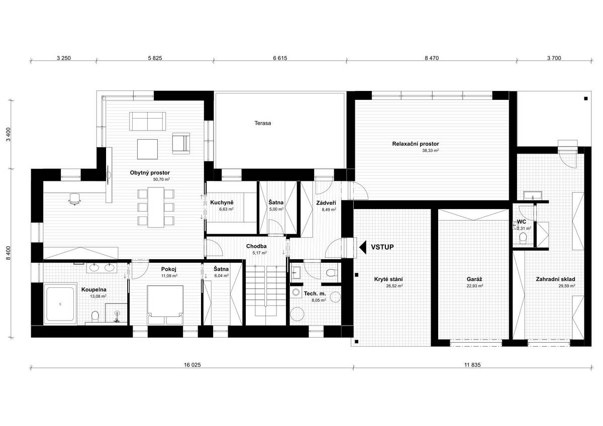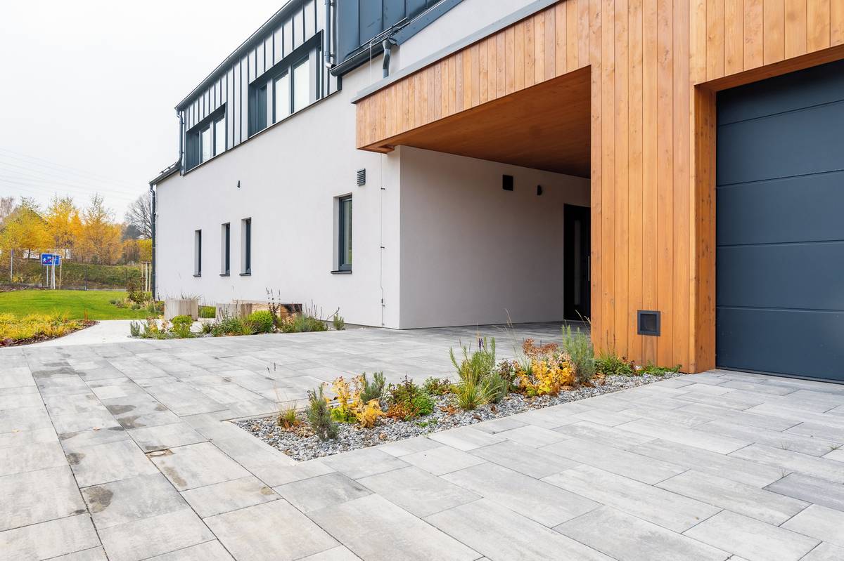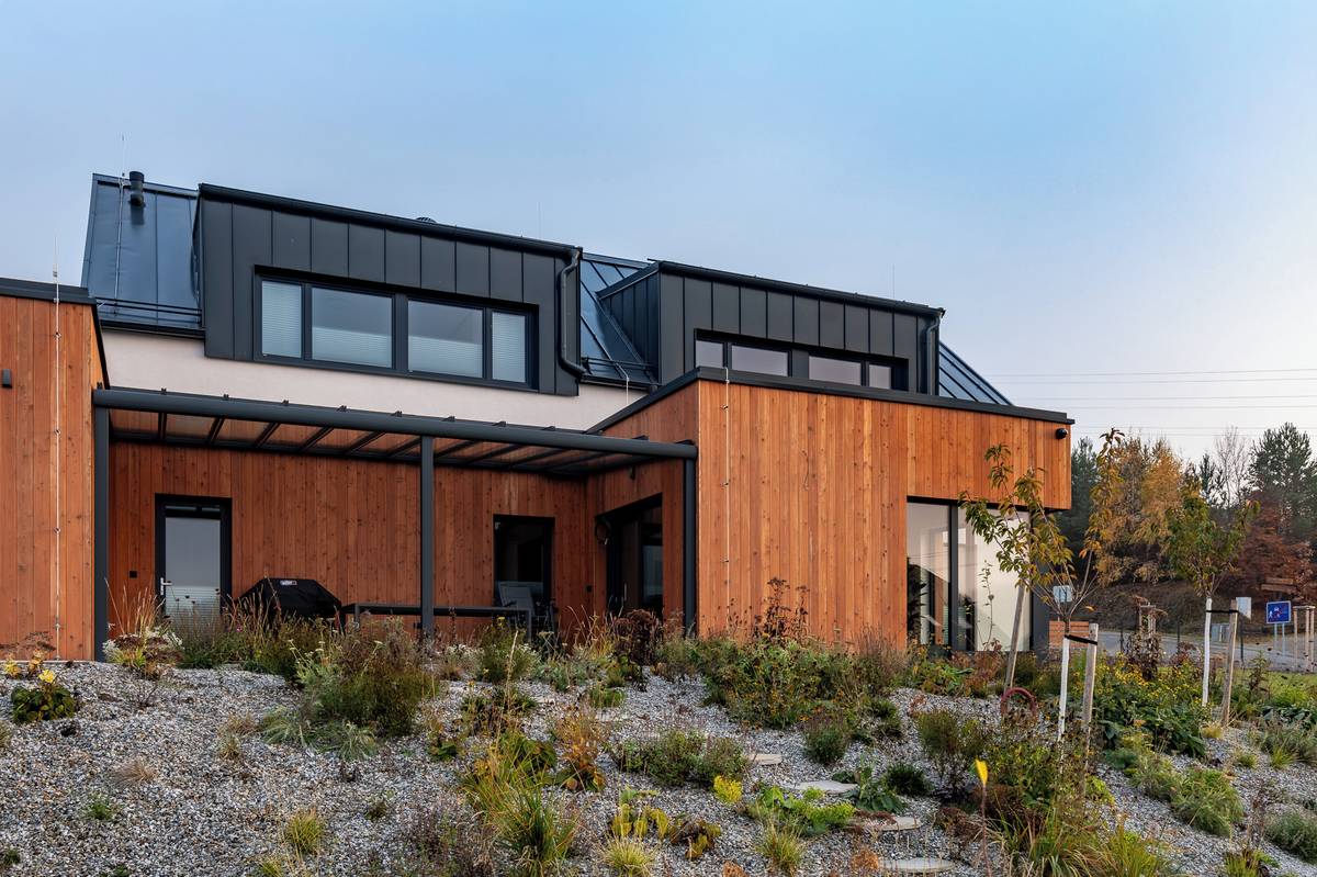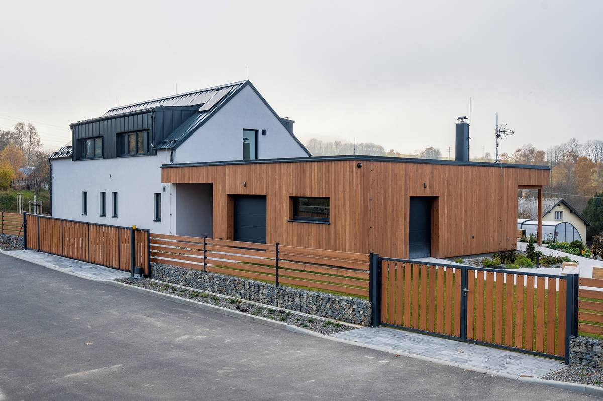 Do objemu domu je zakomponovaná garáž i kryté stání pro vůz.
