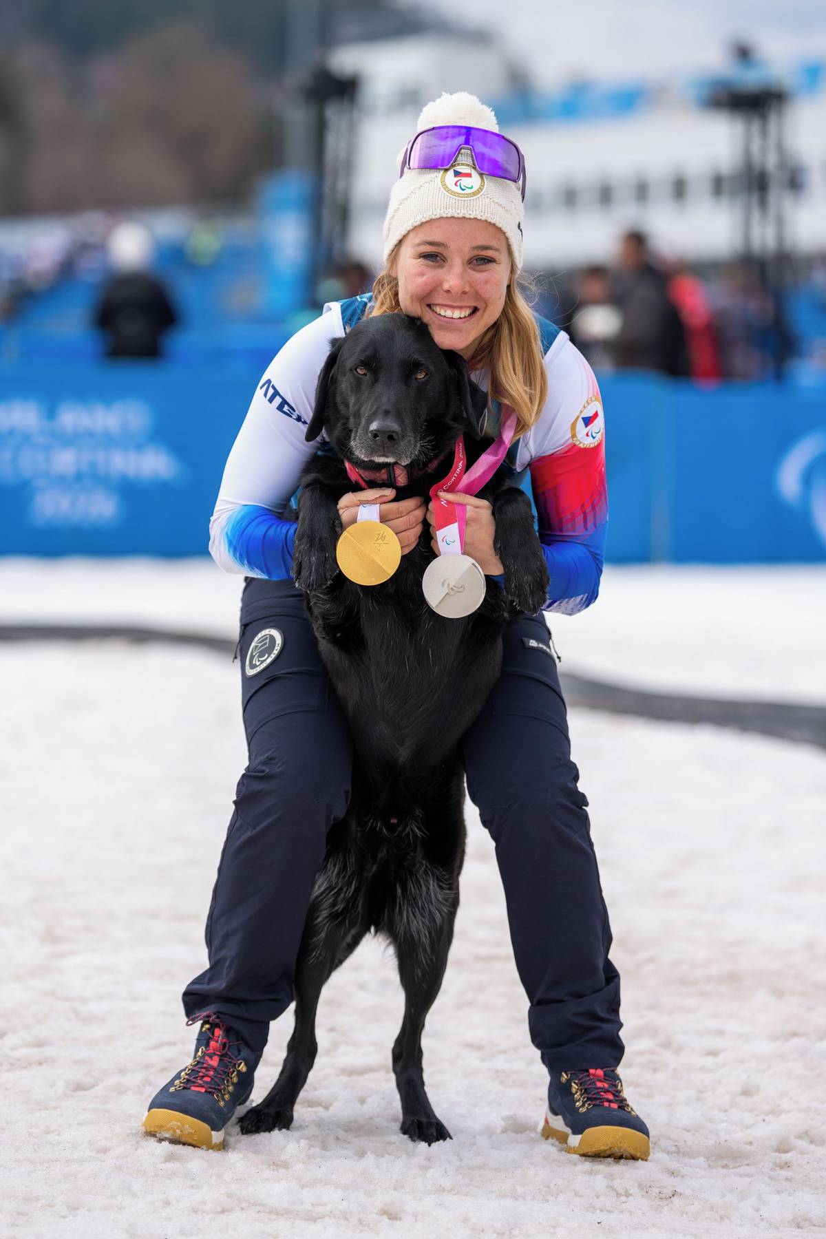 Carina Edlingerová se svými medailemi a milovaným vodícím psem