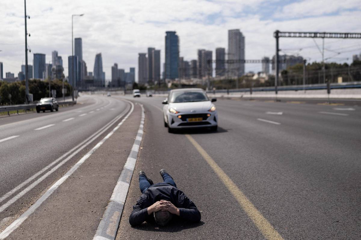 Muž leží na silnici během poplachu při jedné salvě raket z Íránu, 9. března ve středním Izraeli.