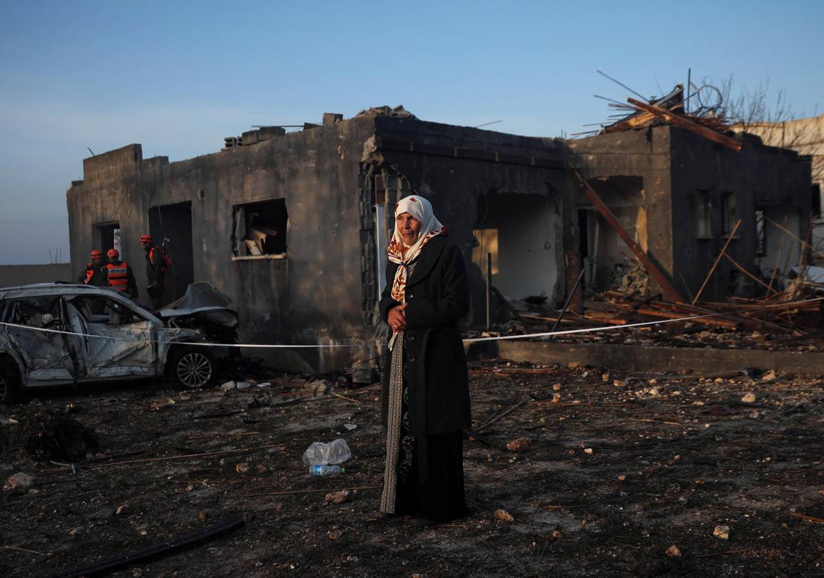 (Žena stojí poblíž místa dopadu íránské rakety, zatímco izraelští záchranáři pracují na místě neštěstí, 13. března v severním Izraeli.)