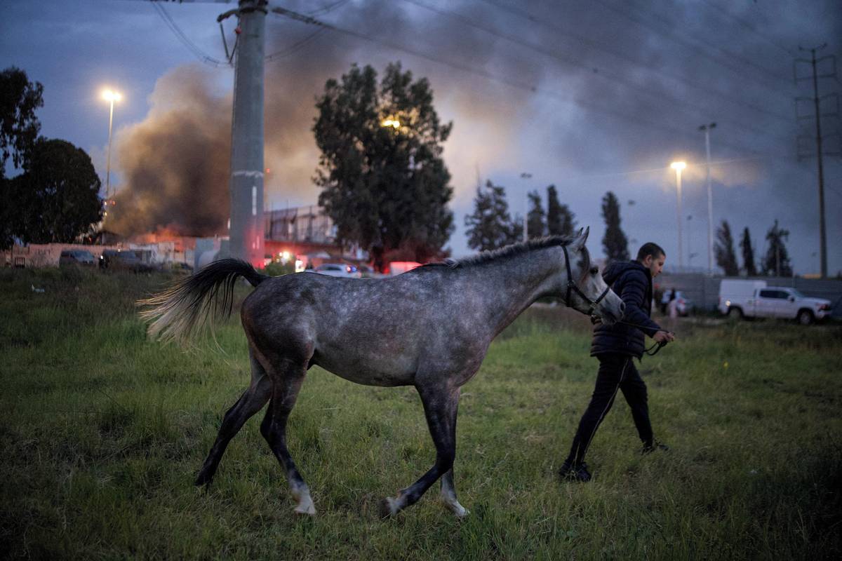 (Muž evakuuje svého koně v blízkosti místa, kam dopadly íránské rakety, střední Izrael, 13. března.)