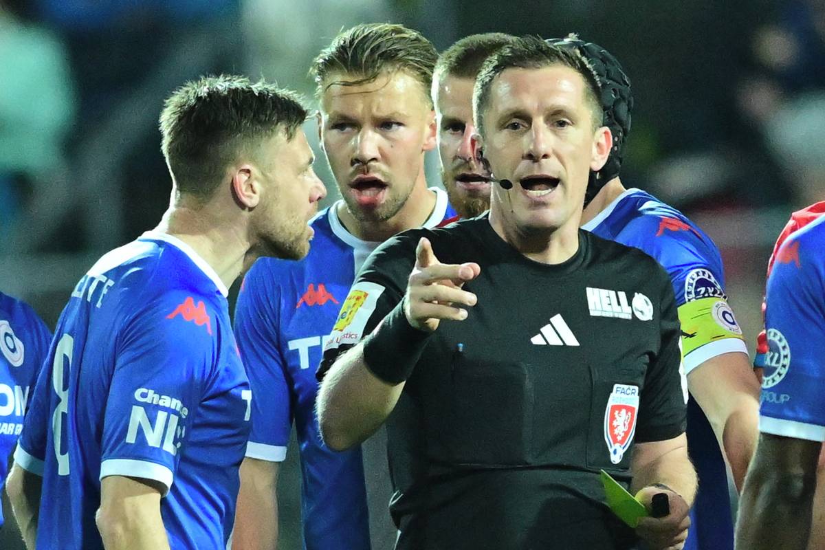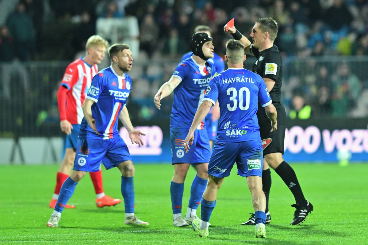 Radim Breite z Artisu (vlevo) vyfasoval červenou kartu od rozhodčího Ondřeje Pechance červenou kartu.