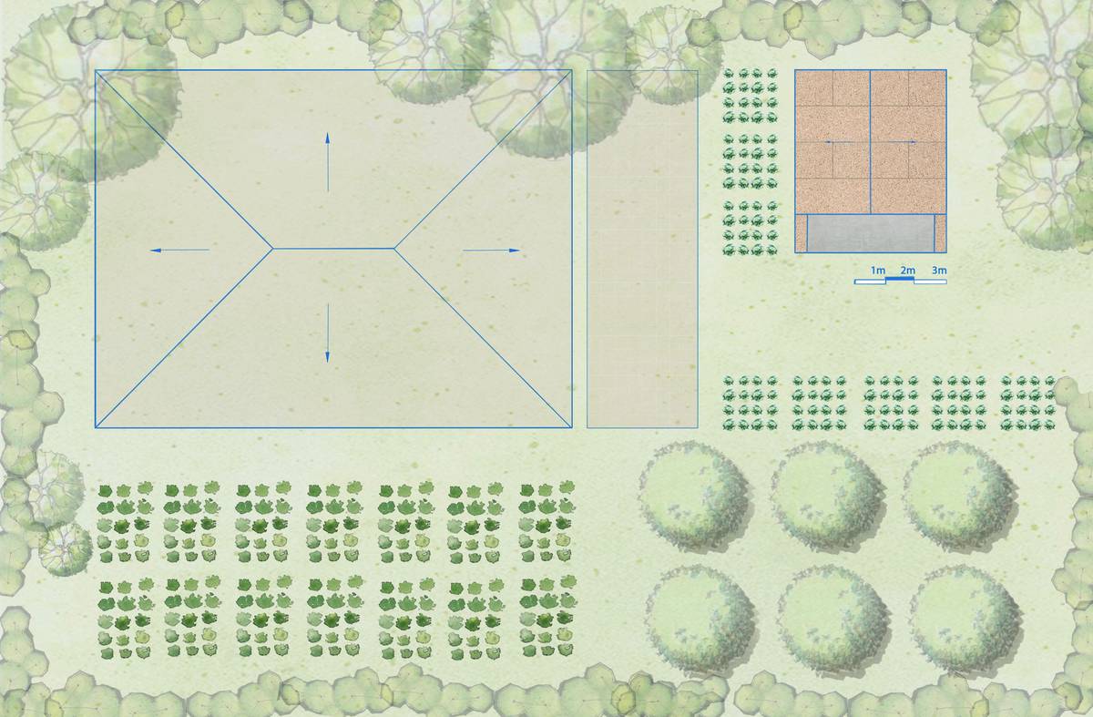Půdorys domku: 1 - lůžko, 2 - úložný prostor