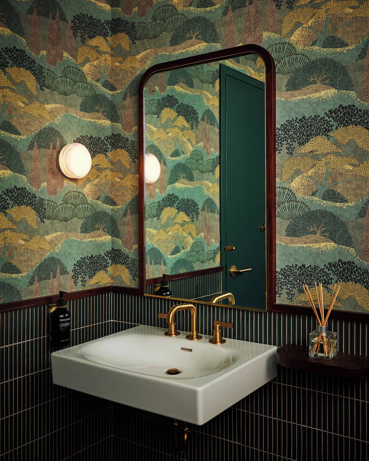 Toaletu dekoruje tapeta v japonském stylu.
