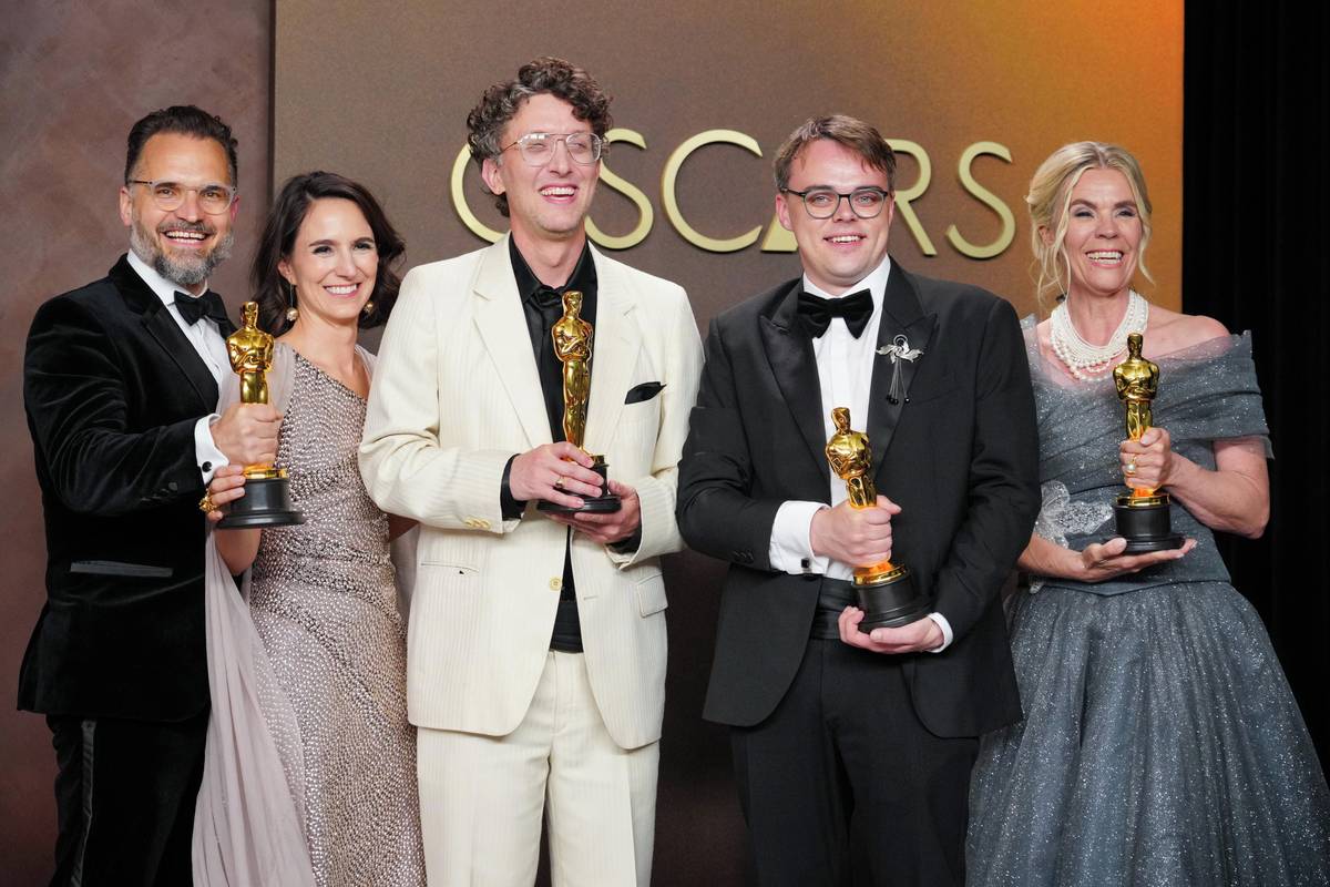 Radovan Síbrt a Alžběta Karásková (čeští producenti zleva), David Borenstein, Pavel Talankin (hlavní hrdina snímku, ruský učitel, který dnes žije v Praze) a Helle Faber, získali Oscara za dokumentární film Pan Nikdo proti Putinovi.