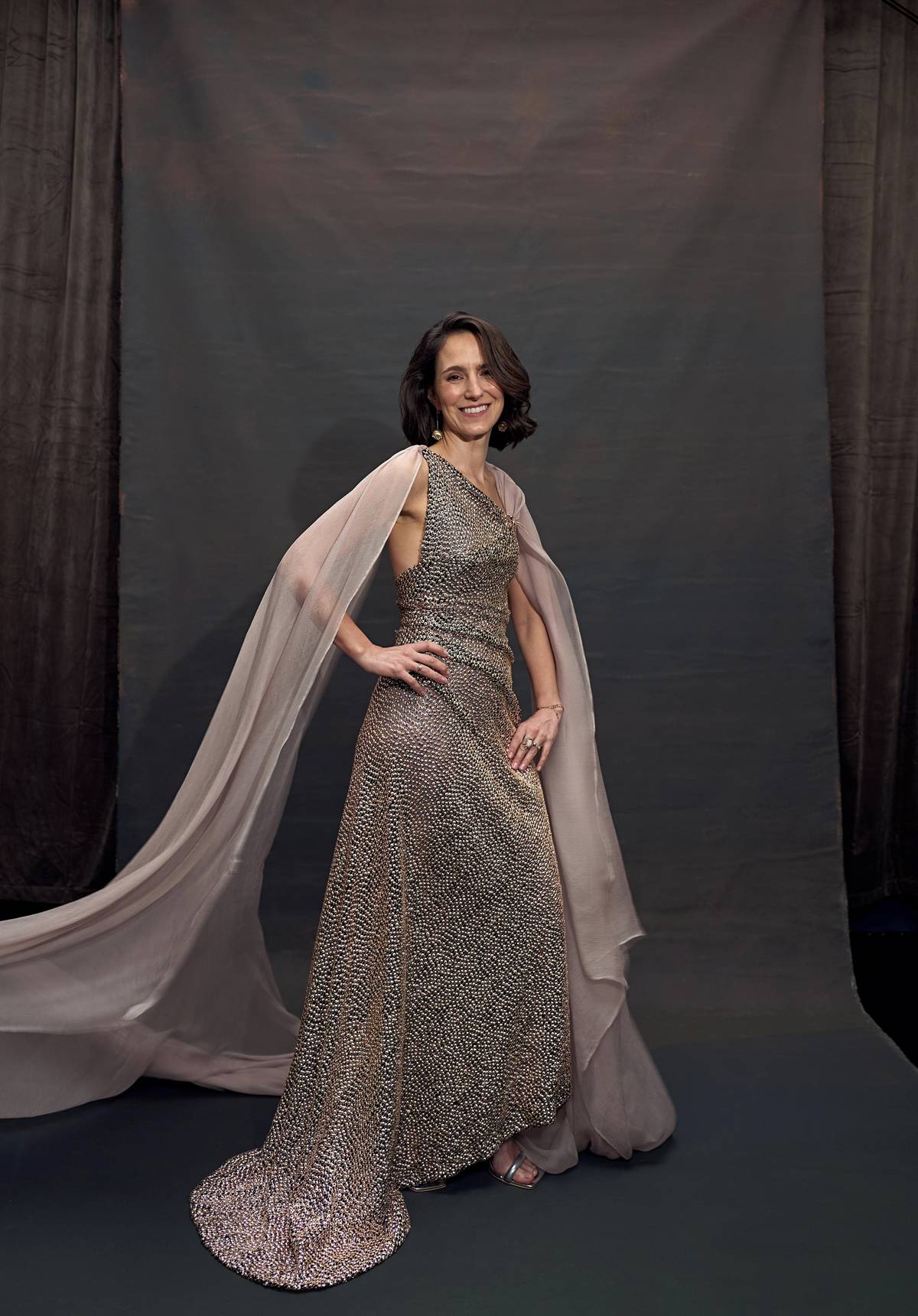 Oscarové šaty přední české značky Leeda skvěle kopírují tvar postavy Alžběty Karáskové, zároveň ale respektují pohodlí a volnost pohybu.
