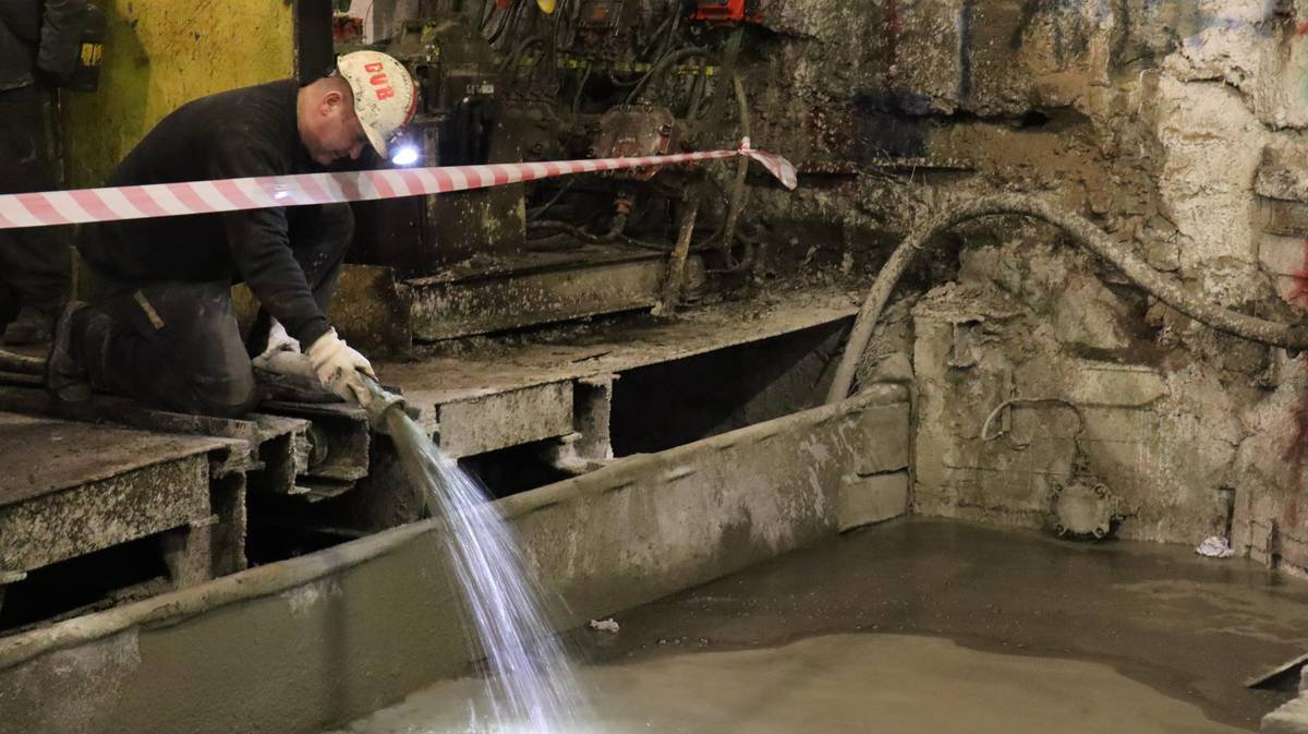 Popílko-cementovou směs Adibet míchají horníci s vodou přímo v podzemí.