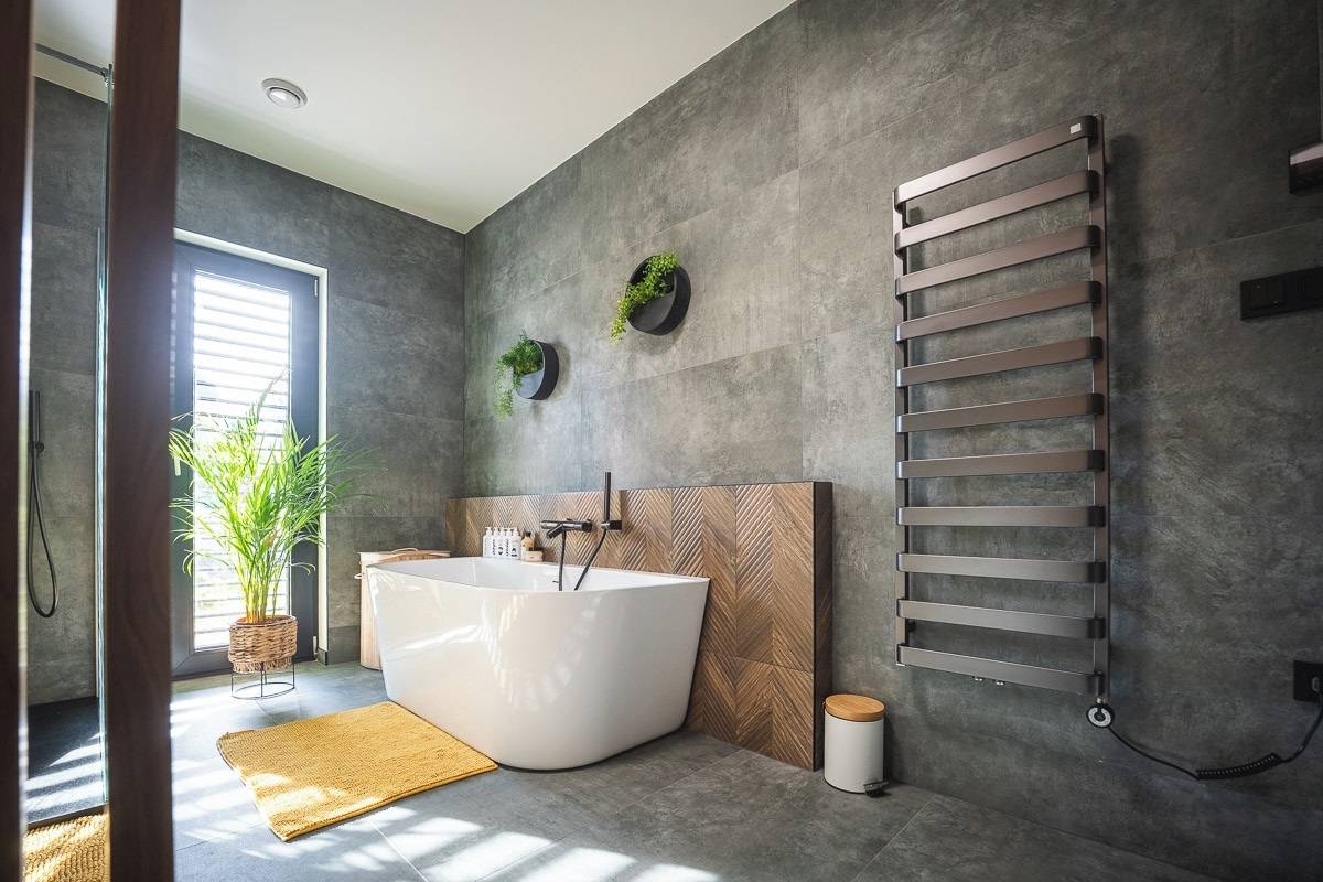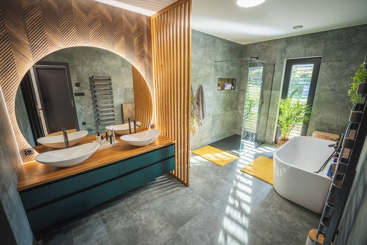 Majitelé chtěli walk-in sprchu bez dveří. Vodu, která by jinak cákala ven, zachytí podložka.