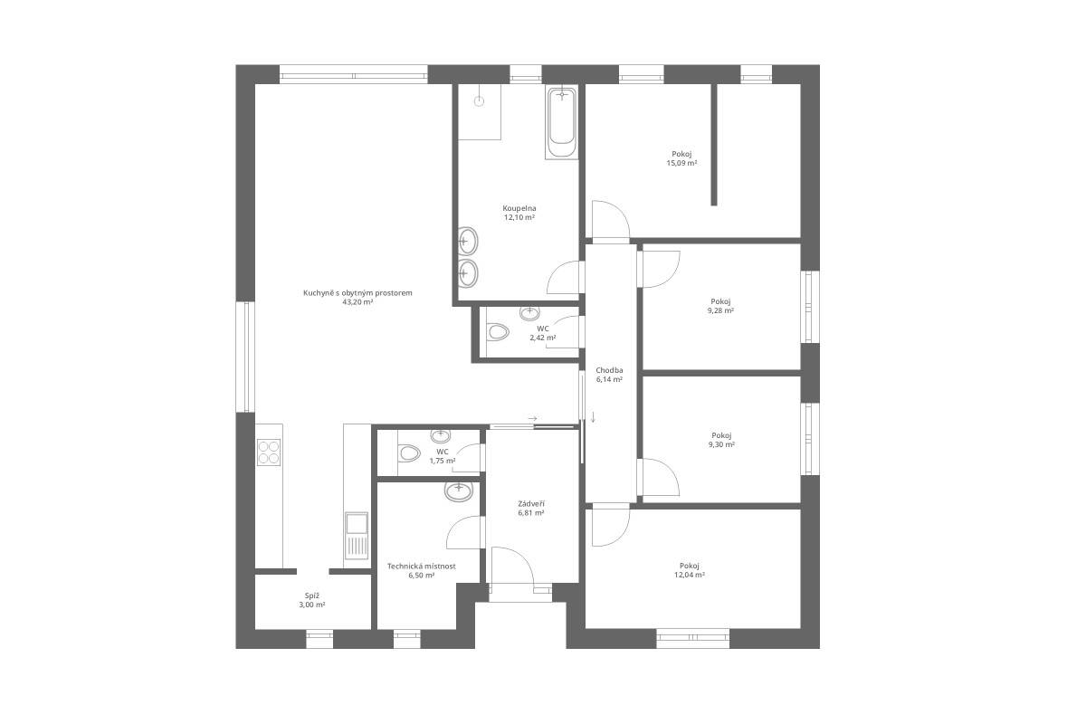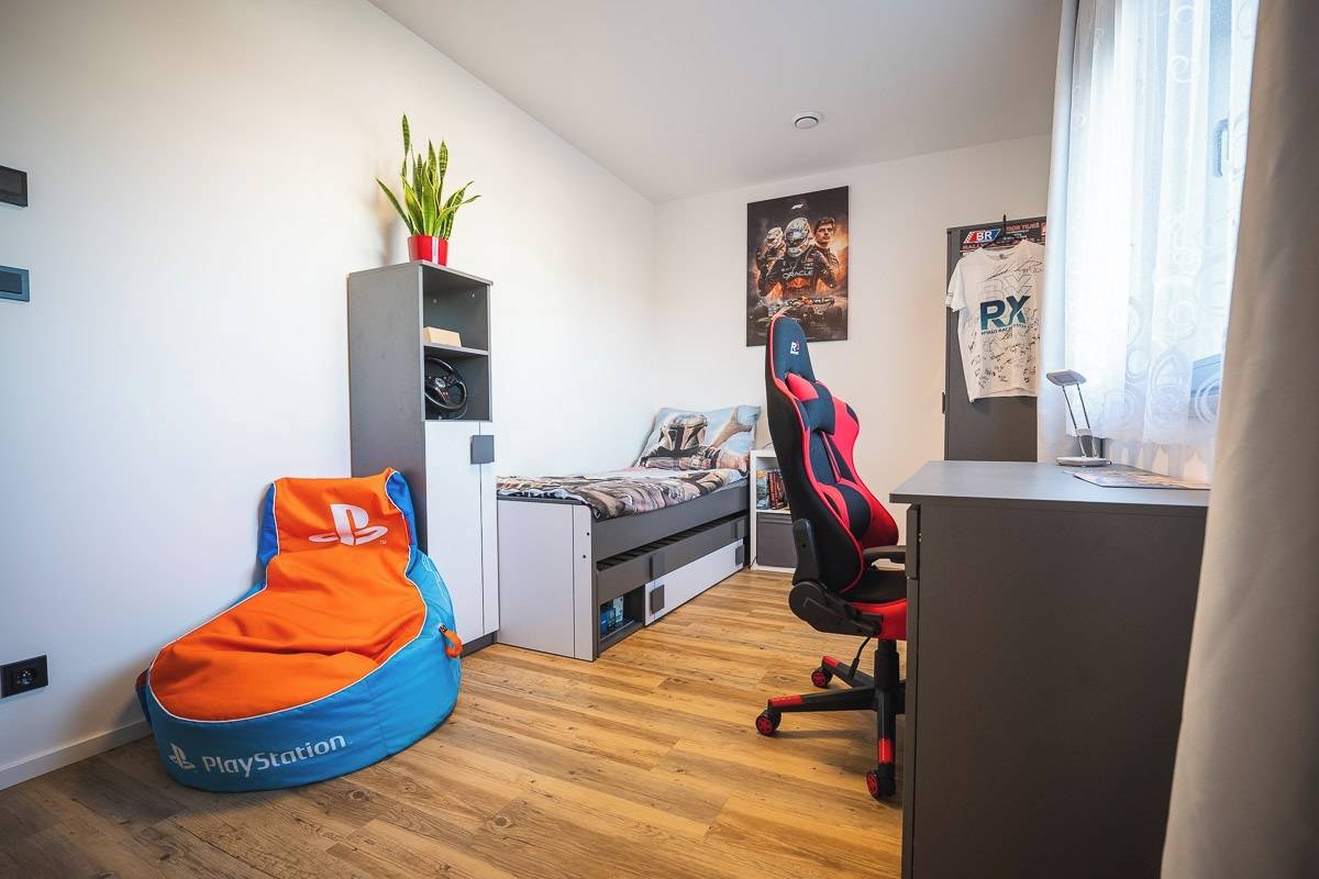 V klidové části, která je na druhé straně domu, se dále nachází tři dětské pokoje, koupelna, samostatné WC a ložnice s šatnou.