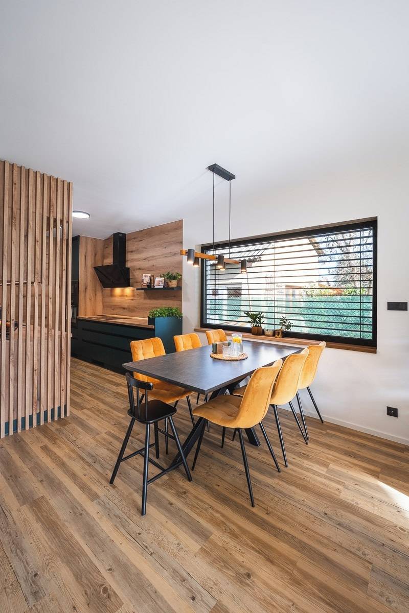 Jídelnu mají navrženou hned vedle kuchyně, což si majitelé pochvalují nejen z praktického hlediska.