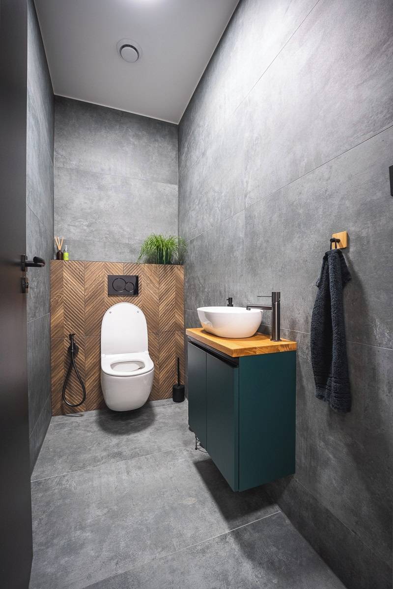 Celý interiér si majitelka sladila do hořčicově smaragdové barvy, a to včetně samostatné toalety u předsíně.