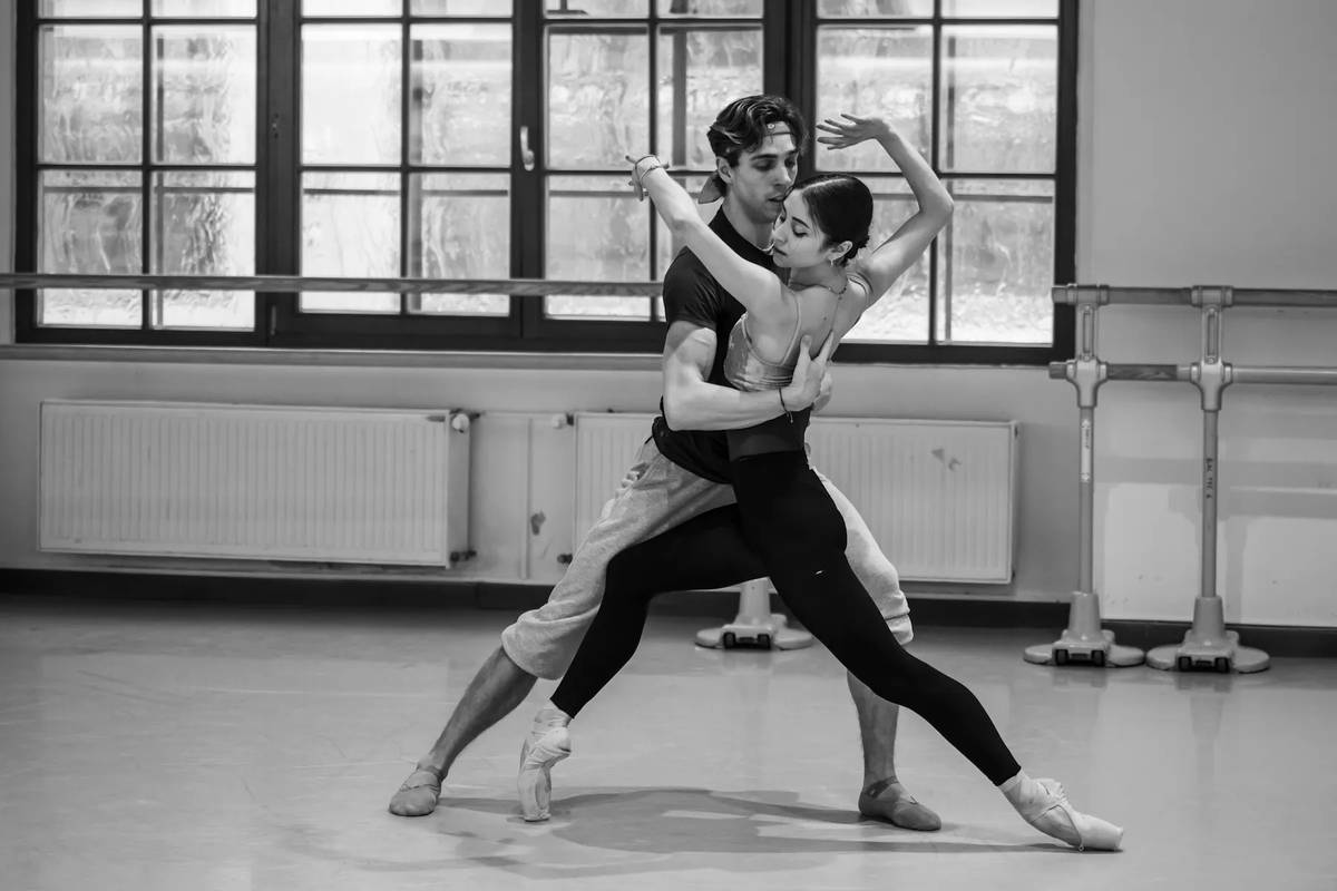 Kostýmní zkouška představení Avant-Garde, které mělo v Národním divadle premiéru 12. března 2026. Tanečníci Kristýna Němečková a Marco Piraino