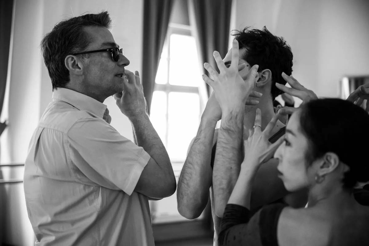 Kostýmní zkouška představení Avant-Garde, které mělo v Národním divadle premiéru 12. března 2026. Choreograf Marco Goecke a tanečníci Sami Gossart a Aya Okumura
