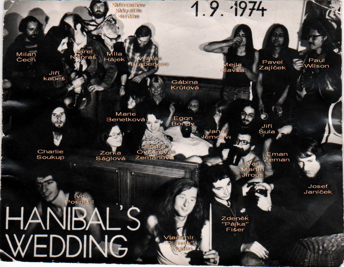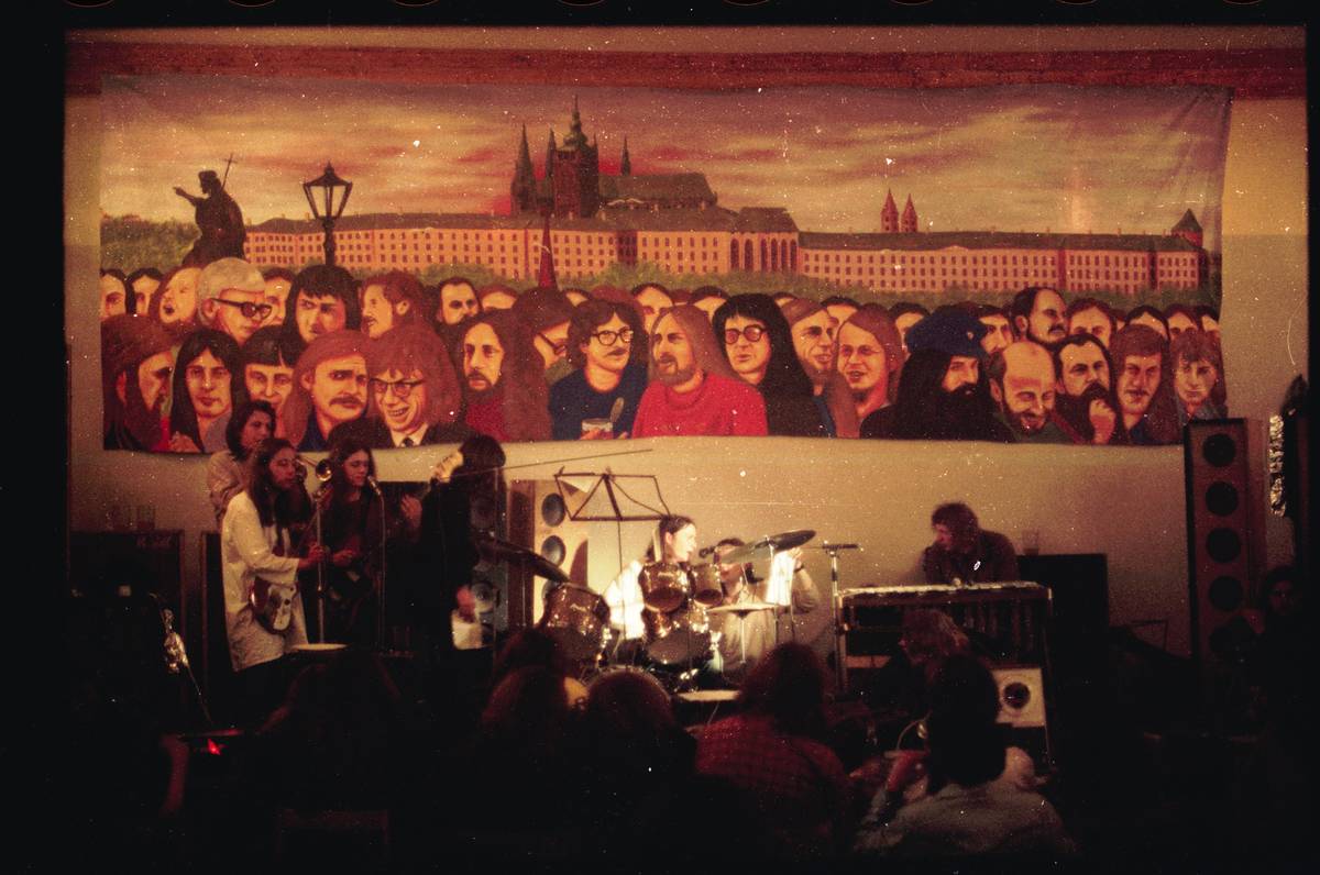Druhý festival „druhé“ kultury v Bojanovicích. Na pozadí známý obraz s pohnutým osudem, zachycující tehdejší významné postavy undergroundu.