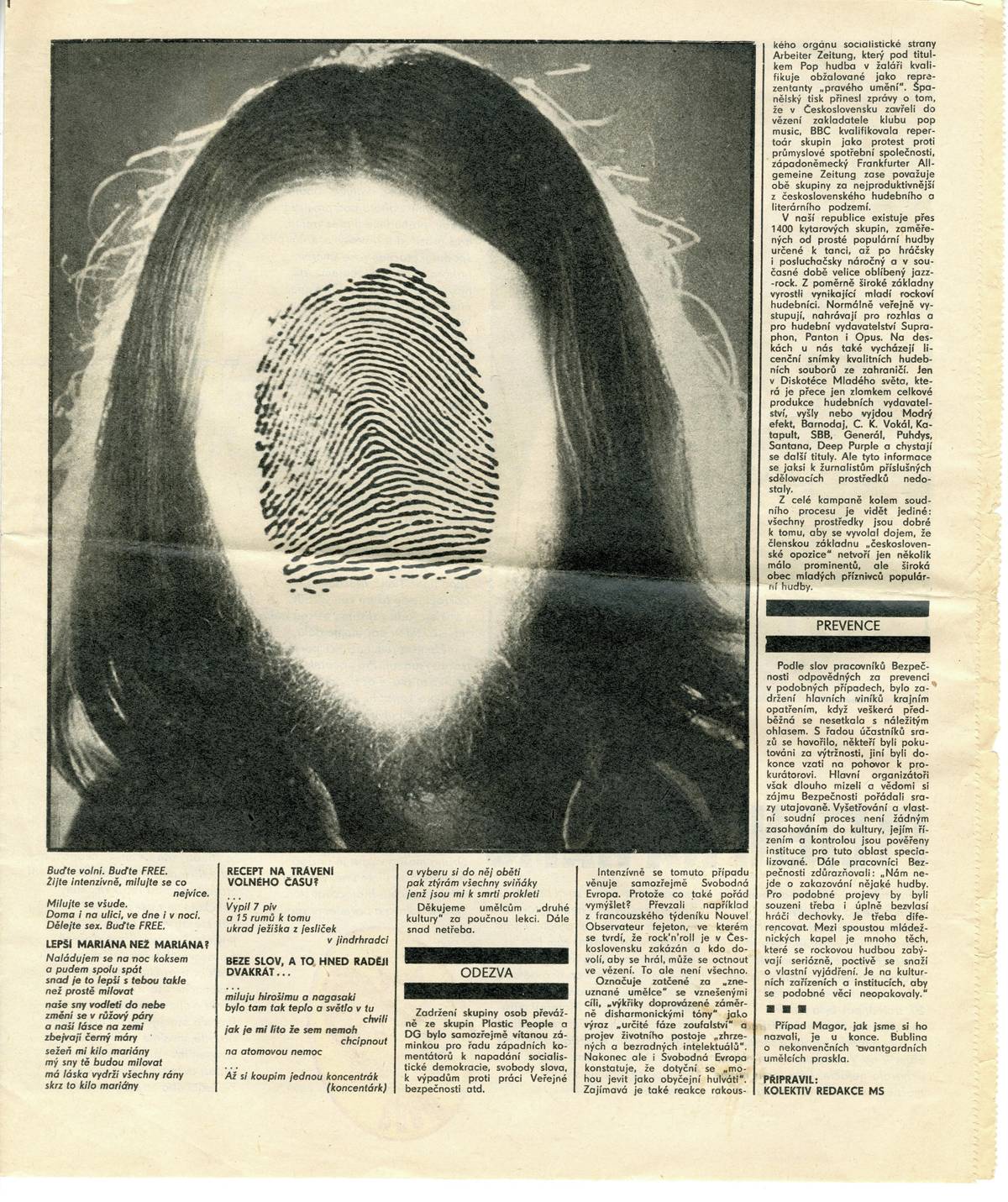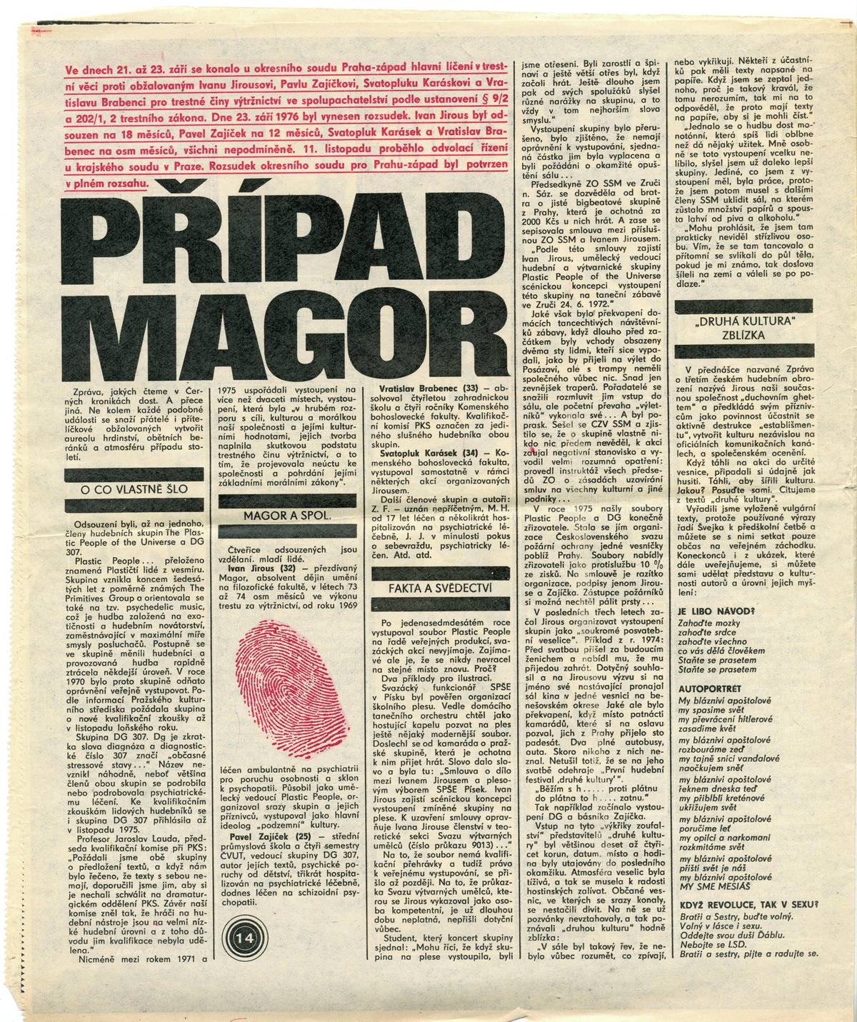 Součástí procesů s českým undergroundem byla dehonestační kampaň. Na snímcích nactiutrhačný článek o Jirousovi, který 3. prosince 1976 vyšel v Mladém světě a jehož jediným autorem (ze tří) je dodnes pouze Jan Krůta.