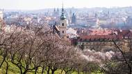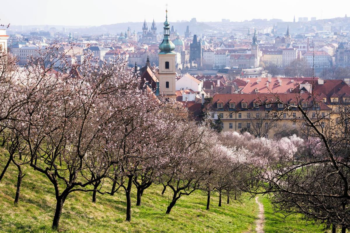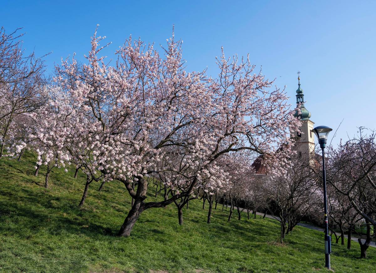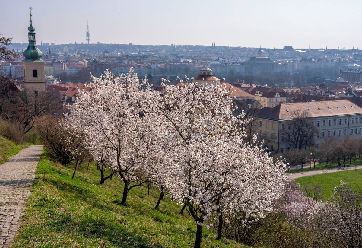 Seminářská zahrada na Petříně na jaře nabízí kouzelný výhled. Rozkvétají mandloně.