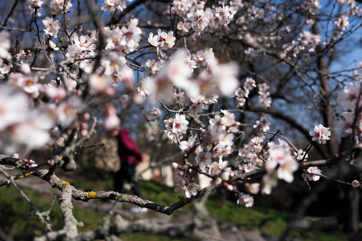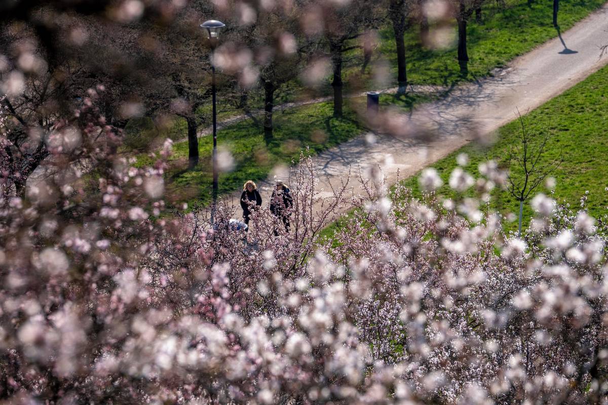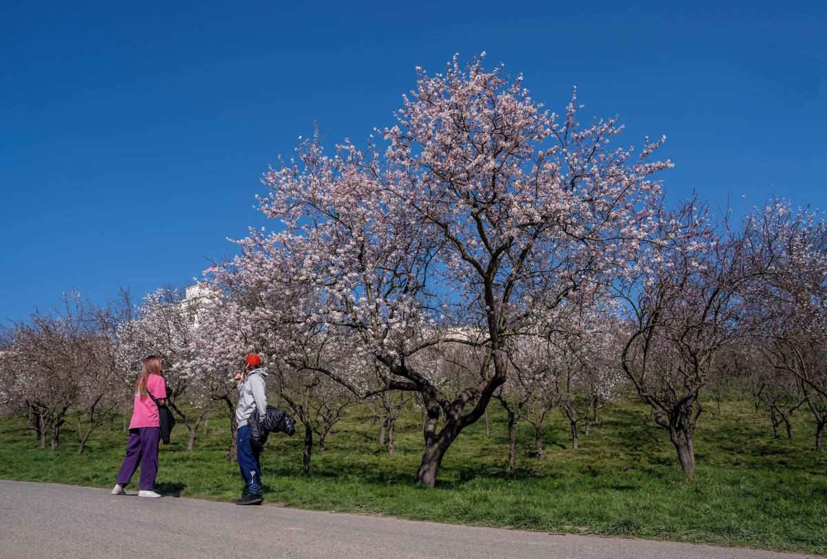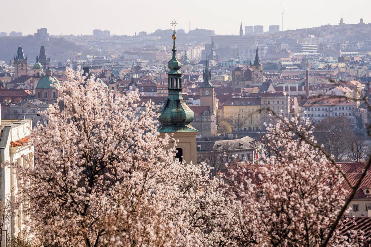 Seminářská zahrada na Petříně na jaře nabízí kouzelný výhled. Rozkvétají mandloně.