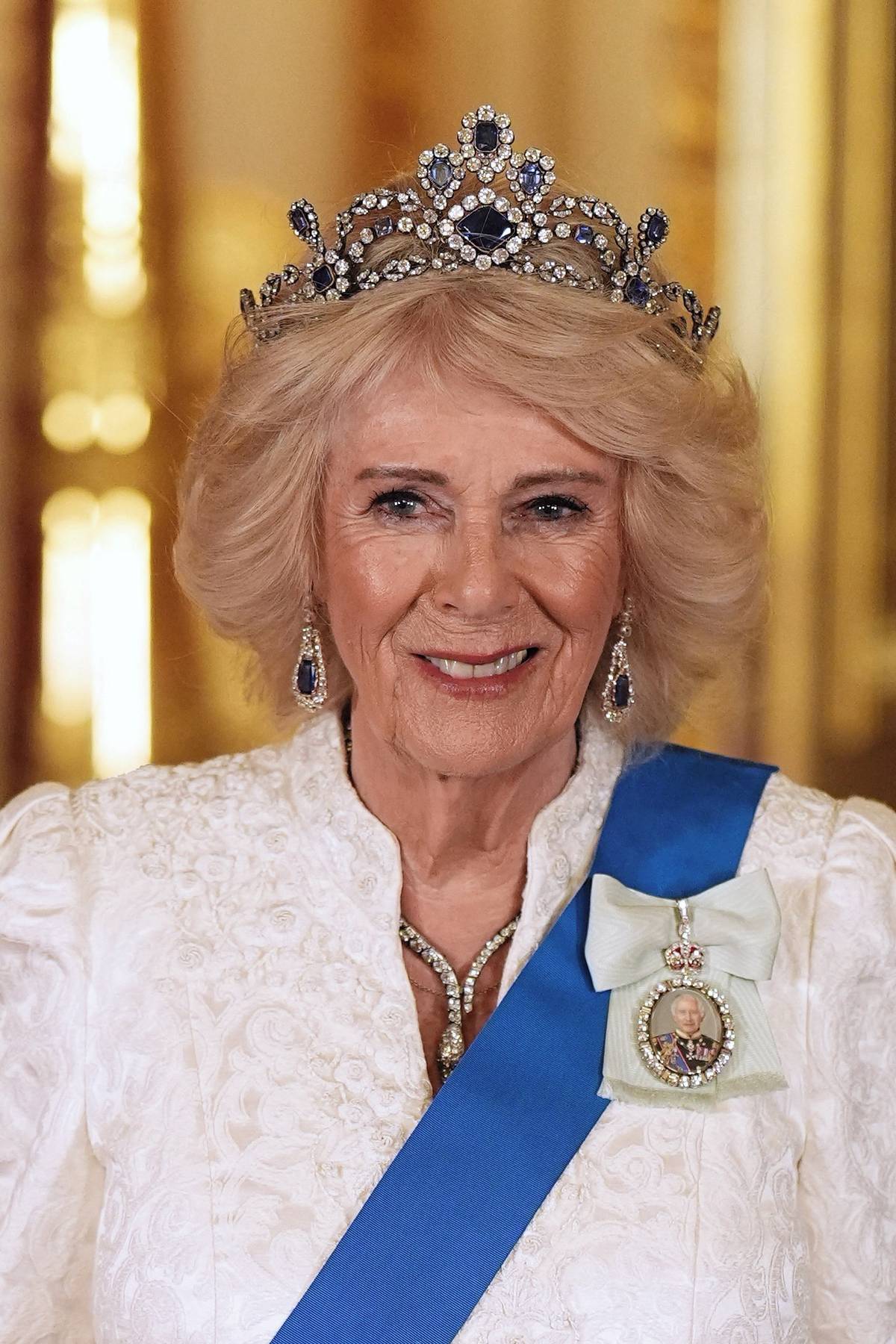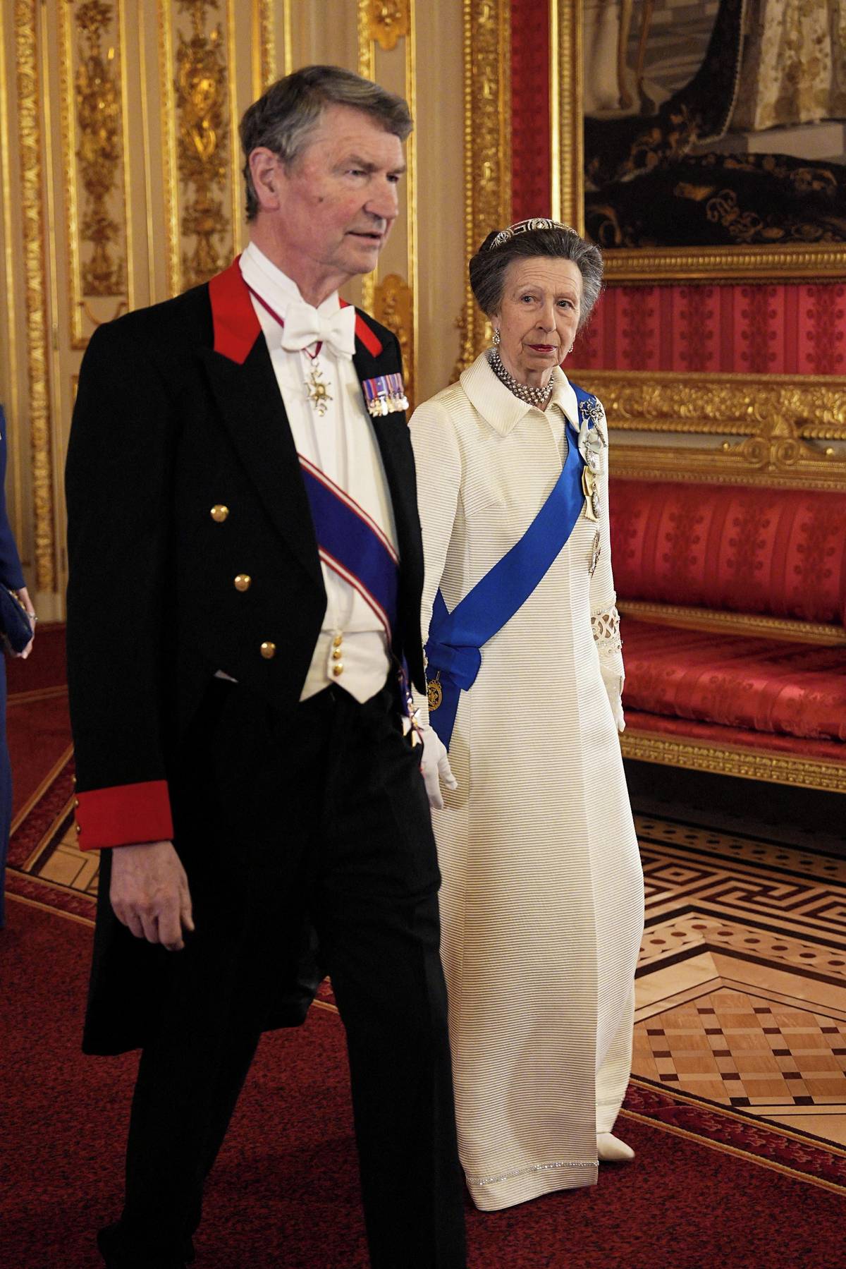 Večer se konal slavnostní banket, kde královna Camilla zářila v krémových šatech návrhářky Fiony Clare.
