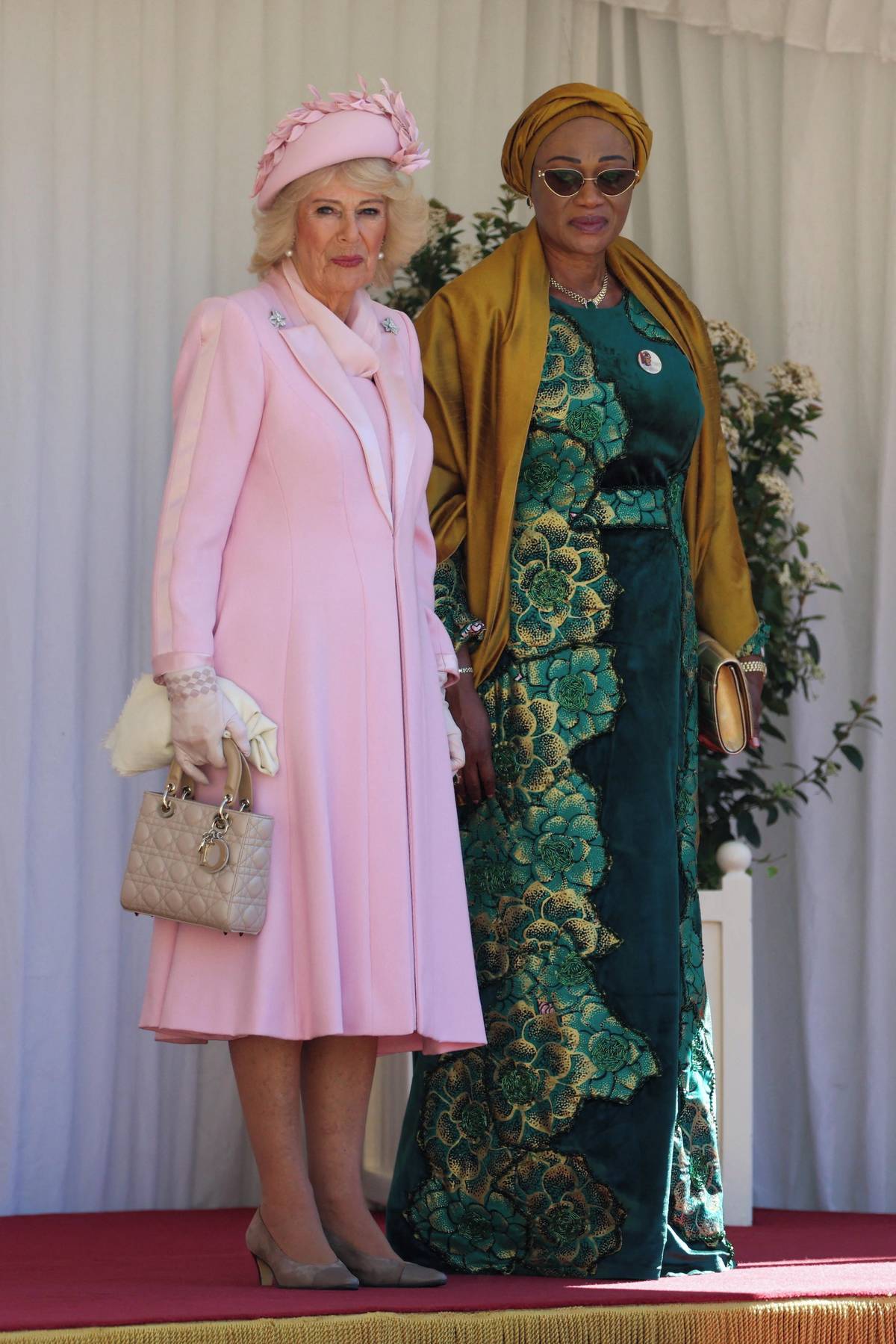 Královna Camilla s nigerijskou první dámou Oluremi Tinubu. Růžové šaty pochází z dílny londýnské návrhářky couture módy Fiony Clare a královna je vynesla například už při návštěvě Paříže.