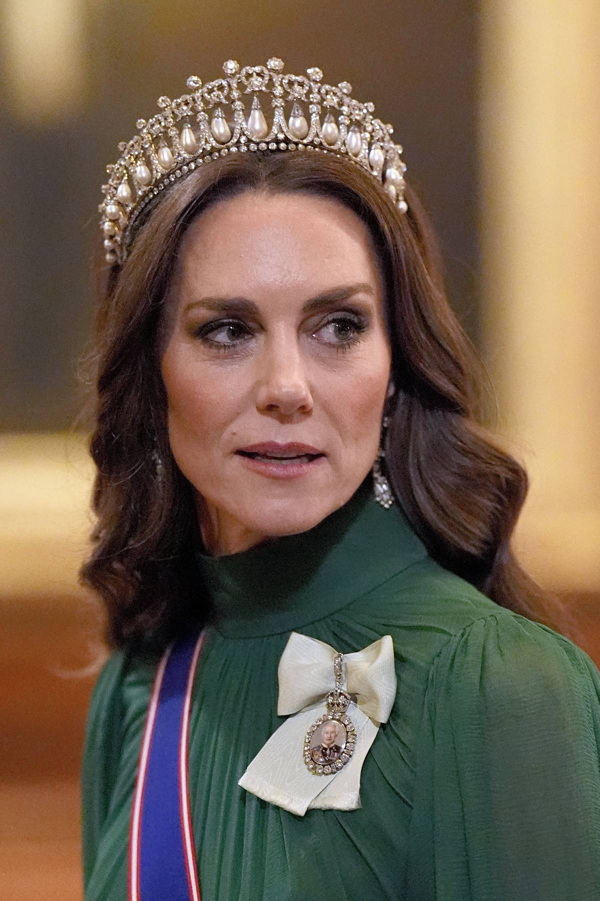 Kate zvolila na večer oblíbenou korunku Lover´s Knot zdobenou několika desítkami velkých perel, kterou kdysi královna Alžběta II. věnovala princezně Dianě jako svatební dar. Právě Diana ji proslavila nejvíce.