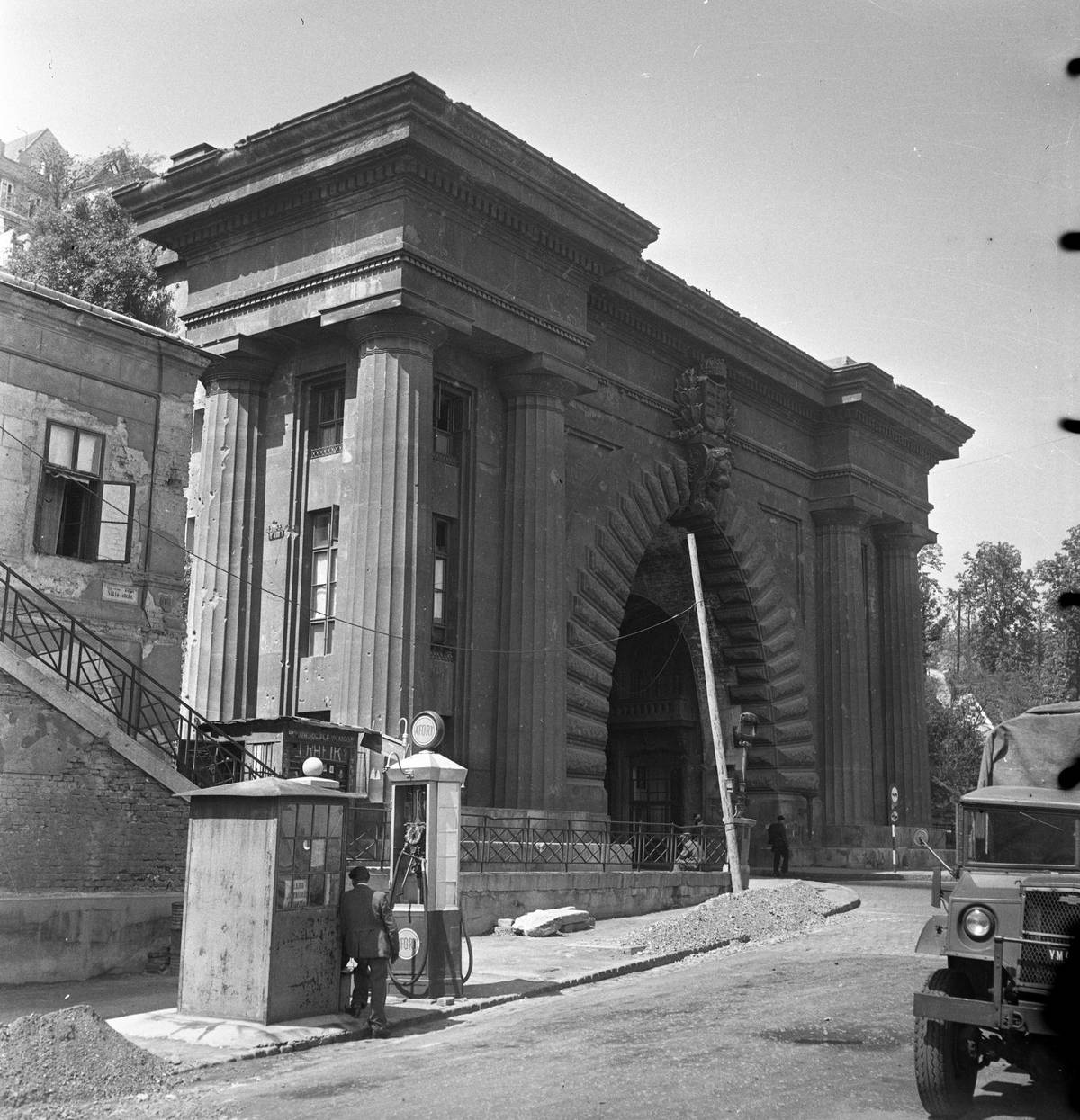Jak to vypadalo v dalších částech východního bloku? Podobně jako v Československu. Toto je například jedna z velmi jednoduchých čerpacích stanic v Budapešti koncem 40. let.