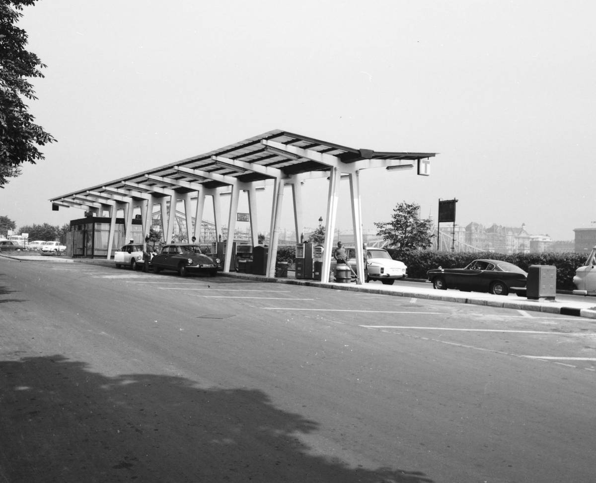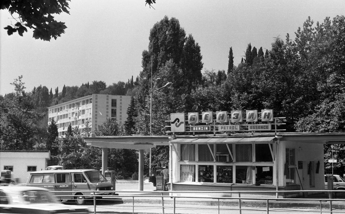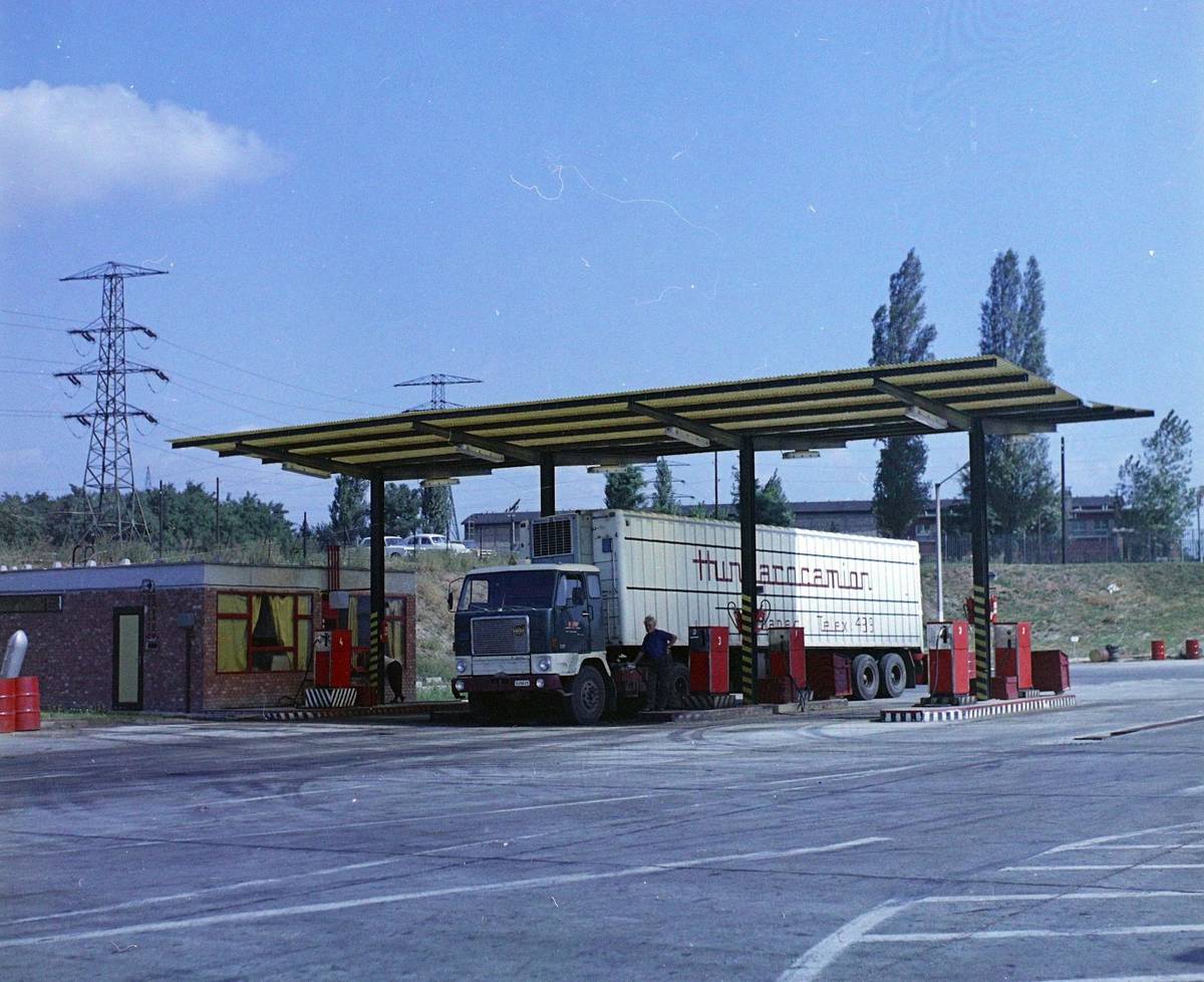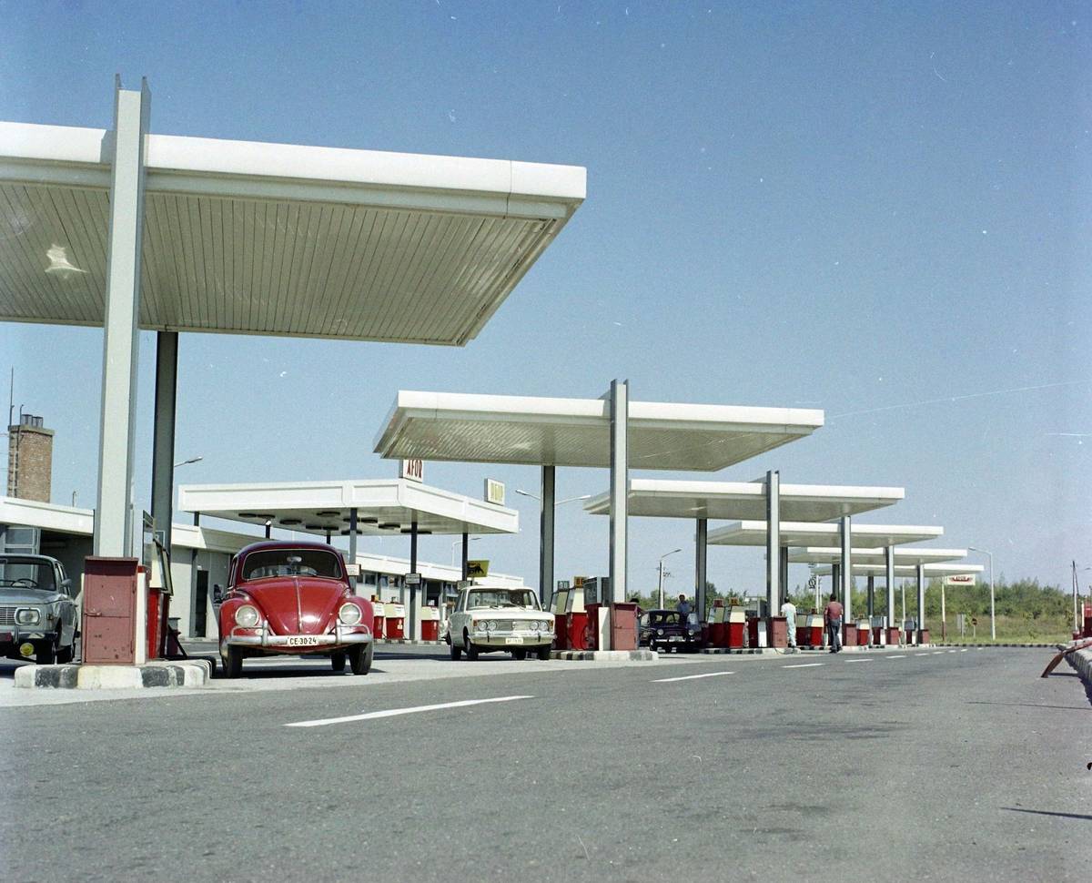 Toto už jsou 80. léta v Maďarsku, kde je vidět, že se podoba benzinových stanic vyvinula a posunula od prostého prodeje paliv směrem k širší nabídce občerstvení a dalších služeb.