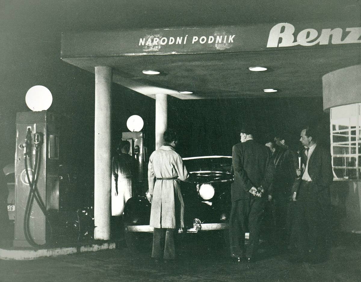 Jak už jsme psali, podoby čerpacích stanic Benzina byly napříč republikou různé a ještě v 70. letech se objevovaly i ty úplně bez přístřešku. Tady snímek z jedné čerpací stanice na Klárově zhruba o dekádu dříve, kde zrovna někdo tankuje palivo do Tatraplanu.